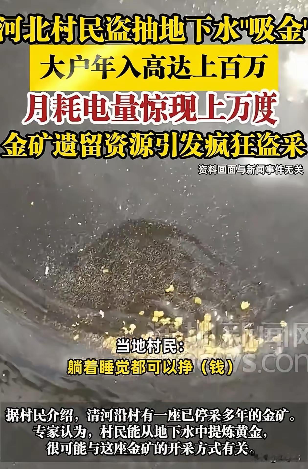 “躺着都能赚钱!”河北一村子的村民在自家院子里打深井,抽地下水来炼黄金,一年能用九万多度电,年收入能达到一百多万! 网友评论: 这个村的井水含金,村民喝了井水金会留在体内,那么这个村的老人去世了是否能炼出黄金。 抽出来的水干嘛不卖给农民浇地呢?还能掩盖提炼黄金的事情。 这是违法活动。地下水资源不可以私自开采。 水是国家的黄金是国家的准备牢底坐穿吧。 抽多了影响饮用水,排河里有污染,都是什么人在喝这些水?