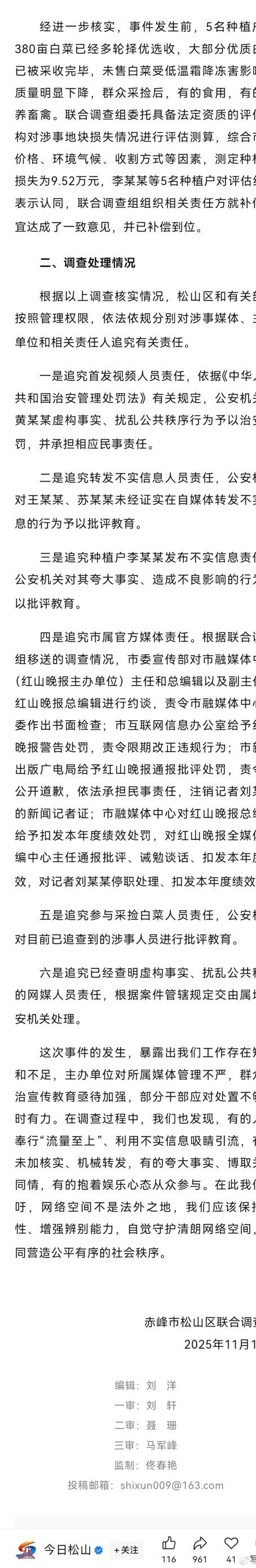 内蒙古赤峰白菜零元购官方动真格处罚了,这是第一次看到有后续处理结果的。某地土豆、桃子被哄抢的,都没有看到后续处理,这一次首先核算了总体损失9.52万,把最早拍视频造谣的黄某治安处罚,交赔偿款。转发推波助澜的洪山晚报处罚加赔偿。种植户李某拍视频夸大损失,也受到了批评。那些参与哄抢白菜的群众,部分也被公安找到批评散装白菜