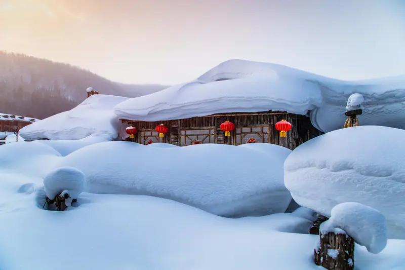 雪蘑菇盖满木屋顶,红灯笼在雪雾中晕染出暖光——这被厚雪拥吻的木屋,藏着整个冬天的