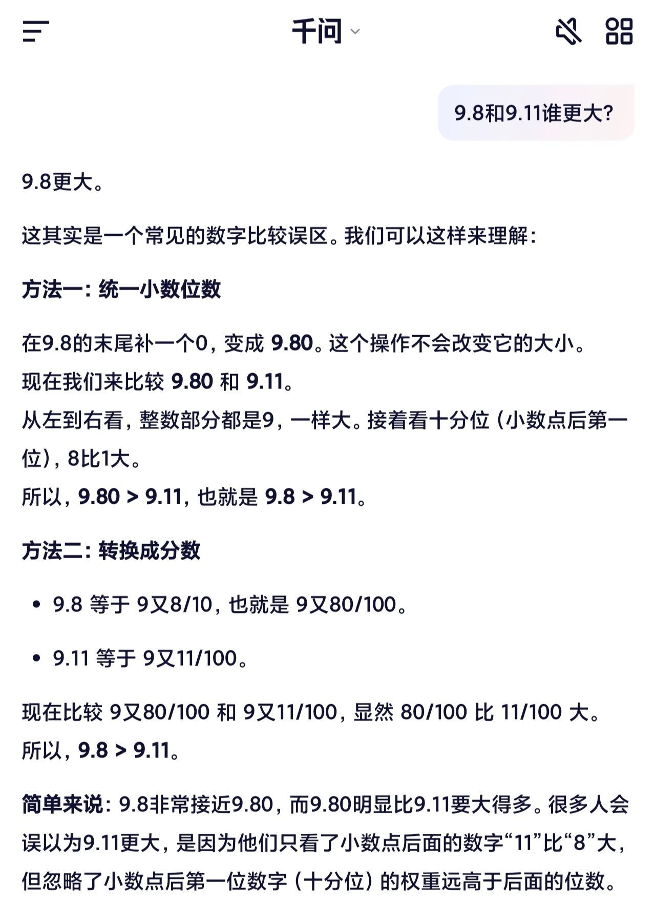 AI忽悠人起来,一套一套的,主要是互联网信息都被喂乱套了,AI成了智障,以前的AI是端水大师,语文水平很高,但是逻辑能力很差劲。比如,以前问大模型9.11和9.8谁大,它能给你比字符串长度;问草莓英文几个r,它能当场死机,现在终于有AI肯老老实实比较数值、数字母了。技术突破,是给人工智障补常识课,逻辑能力是基础科学,这个很重要,更复杂的难题都要依赖逻辑算法,比如我给千问一个问题,0.999....9的循环和1比大小,它给出了很标准的答案,这就是逻辑算法的进步。