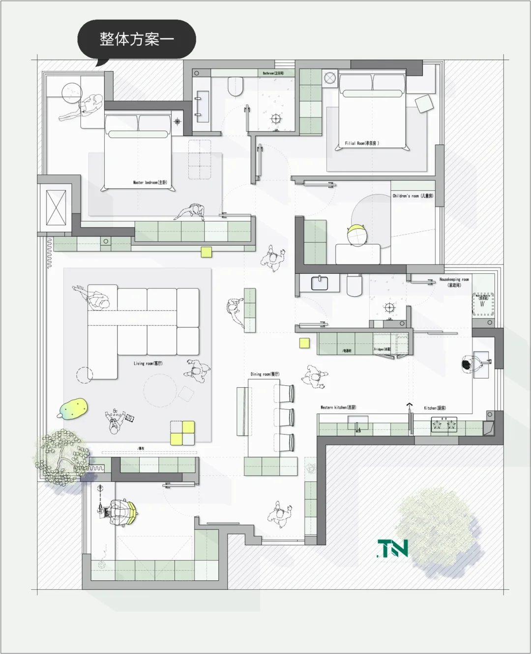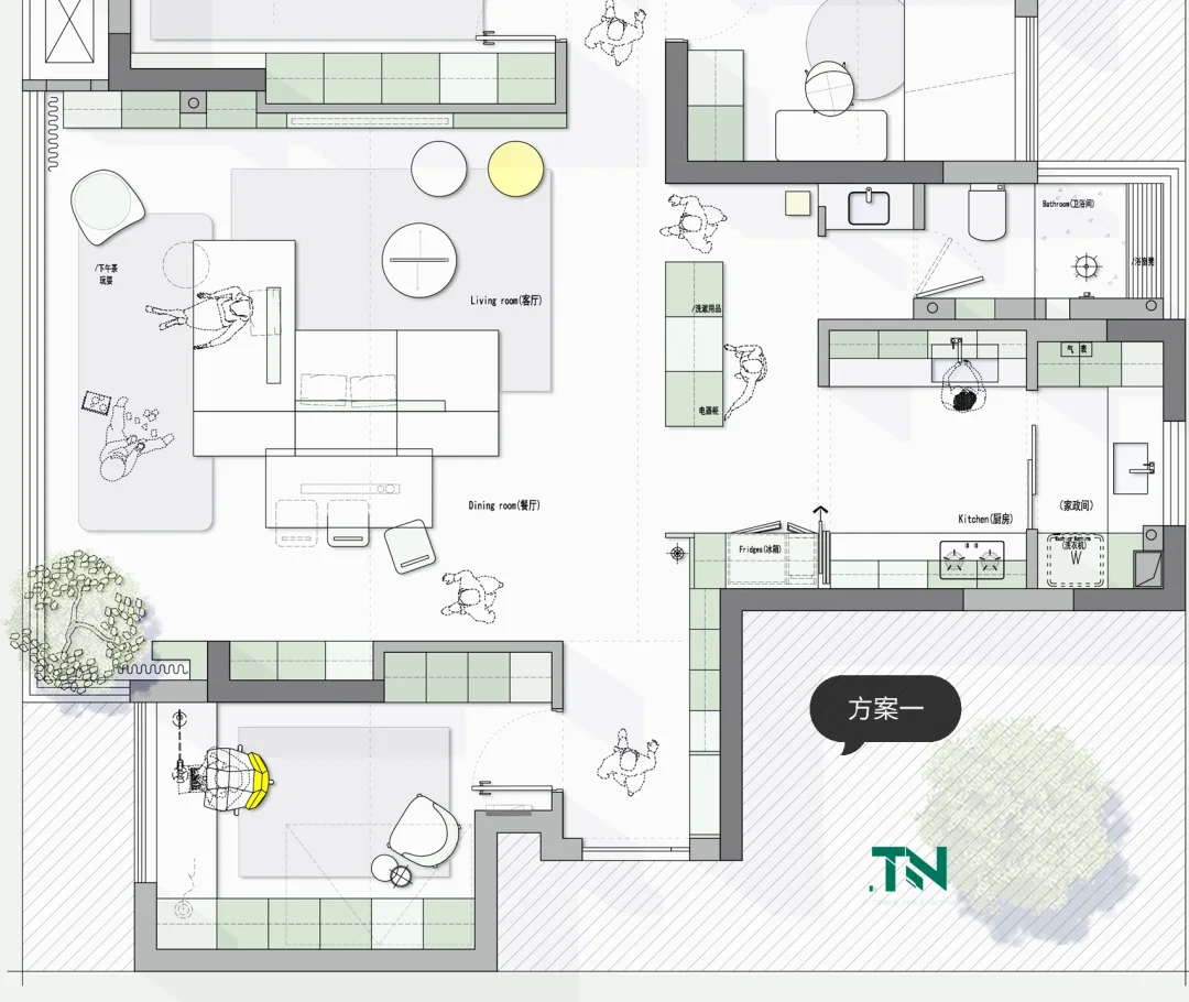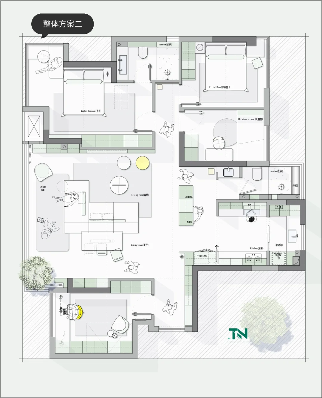 来自小红的委托 小红已经在当地做好设计,一直不满意厨房与餐厅的处理,原始结构餐厅空间过小,客厅空间较大,如何处理厨房、餐厅、客厅之间的关系。 设计委托需求: 1、家里常住人口5人,4大1小(孩子10个月),有可能孩子爷爷要来小住 ,所以要3个卧室,1个多功能房兼书房的功能; 2、男主人是做广告的,喜欢打游戏,躺沙发上看电视,客厅要保留电源放ps5(平时一般是放书房),switch,家里老人也喜欢看电视。 女主人是程序员,就喜欢刷刷手机、有时候看看电视 由于有了小孩,喜欢在即烹饪,需要大点厨房 3、客厅保留一个玩耍区,收纳空间尽量多,餐厅需要有餐边柜或岛台用于收纳,就是客厅空间尽量开阔 ,我老公想买个大电视,收纳要充足。 4、卫生间两个都要坐便器 5、希望设计的动线要便利。 来看看优化后,你会选择哪个方案