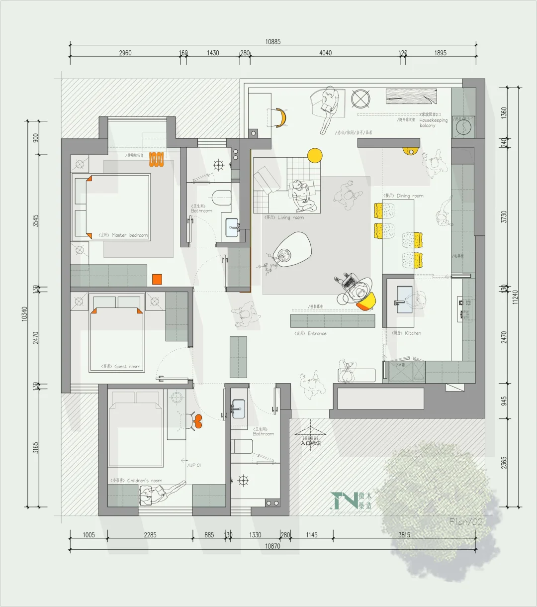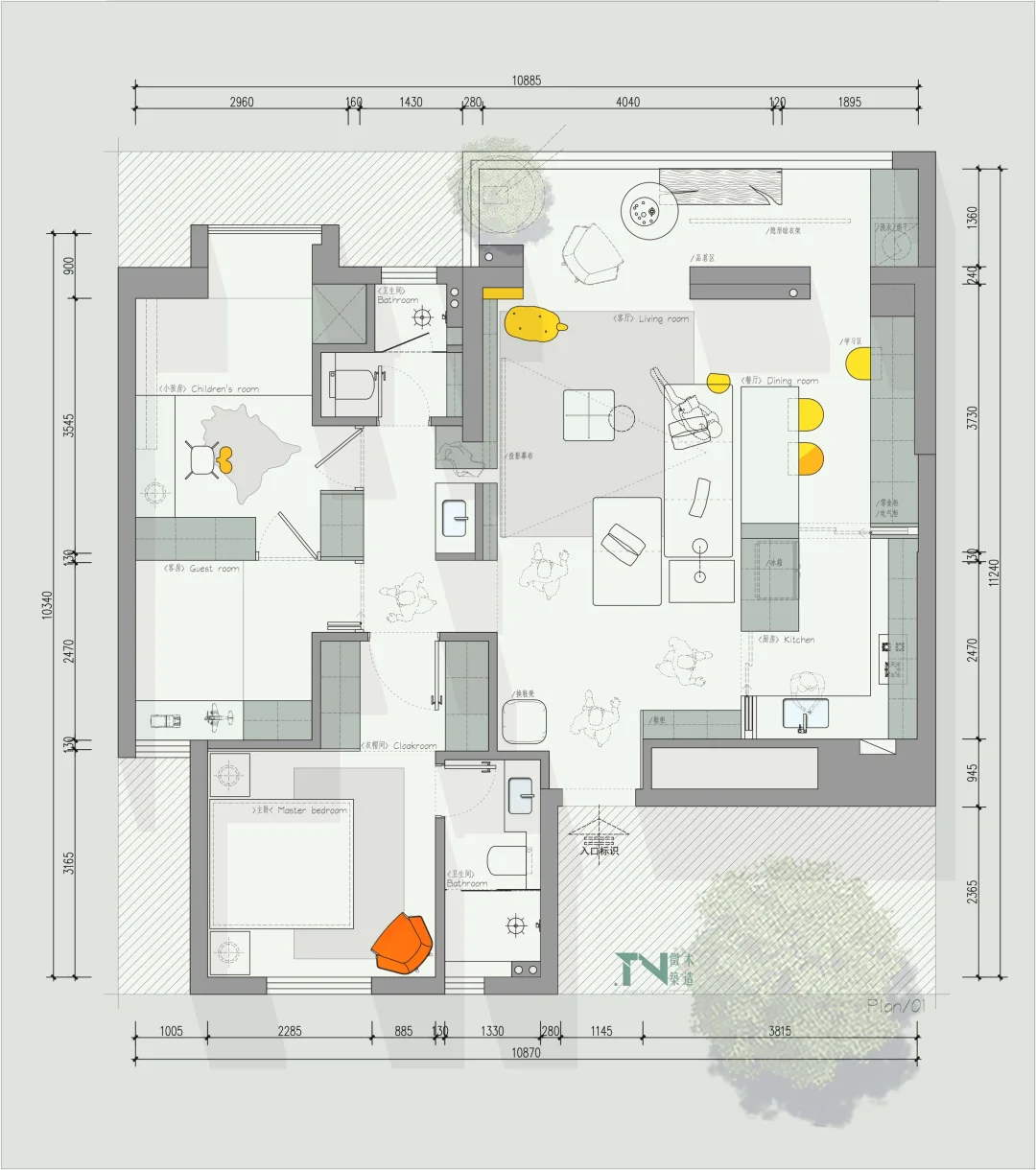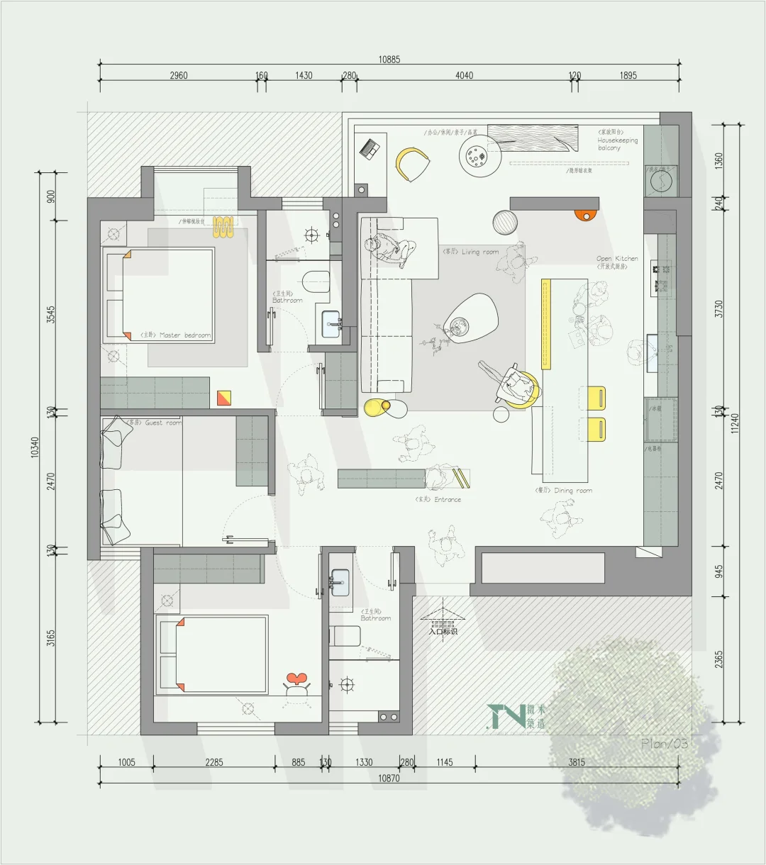 设计需求: 1、一家三口👨👩👦 2、主卧、孩子房、客房 3、要玄关(不要一入门就看到客厅) 4、客厅餐厅一起、厨房开放式 5、一个喝茶区