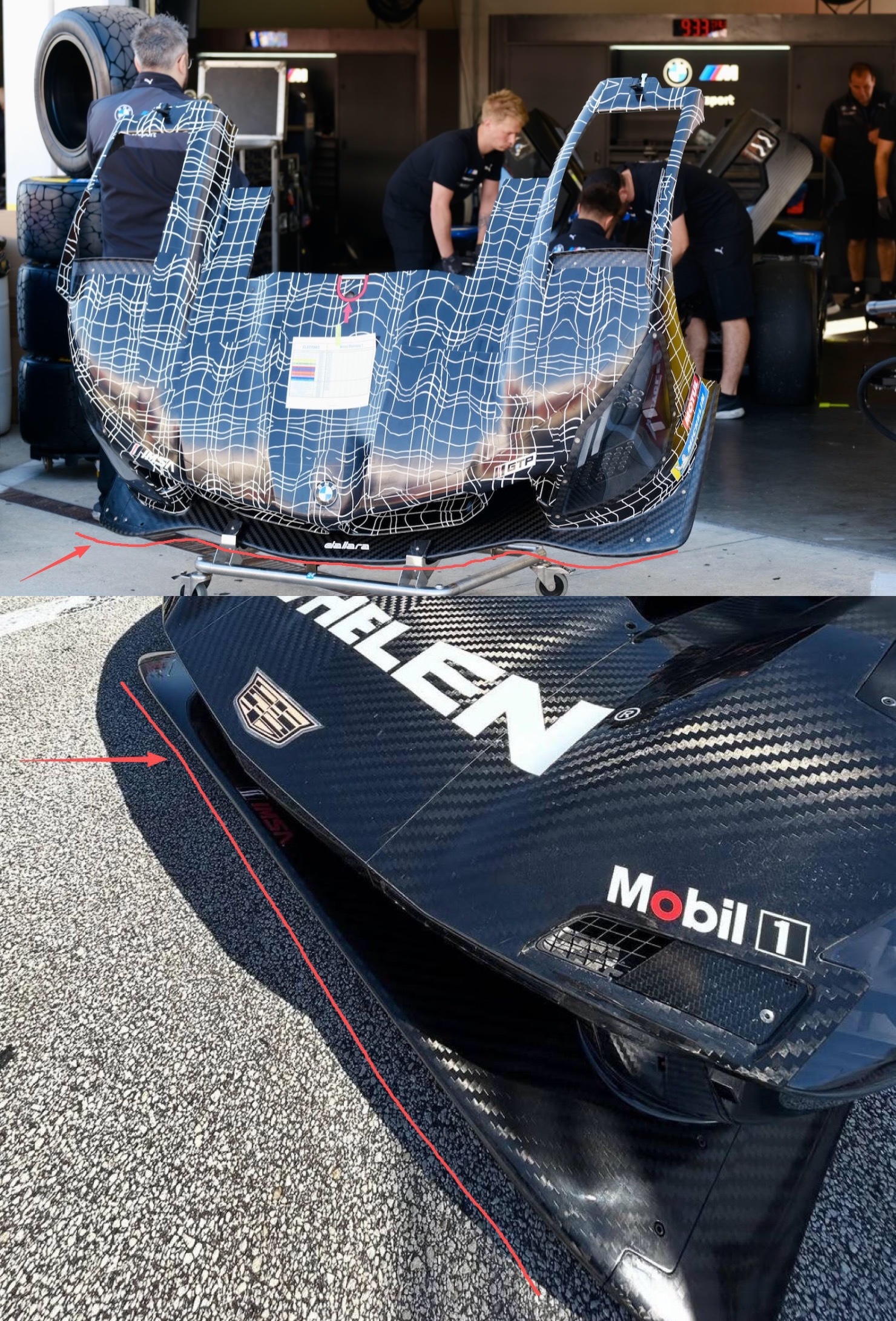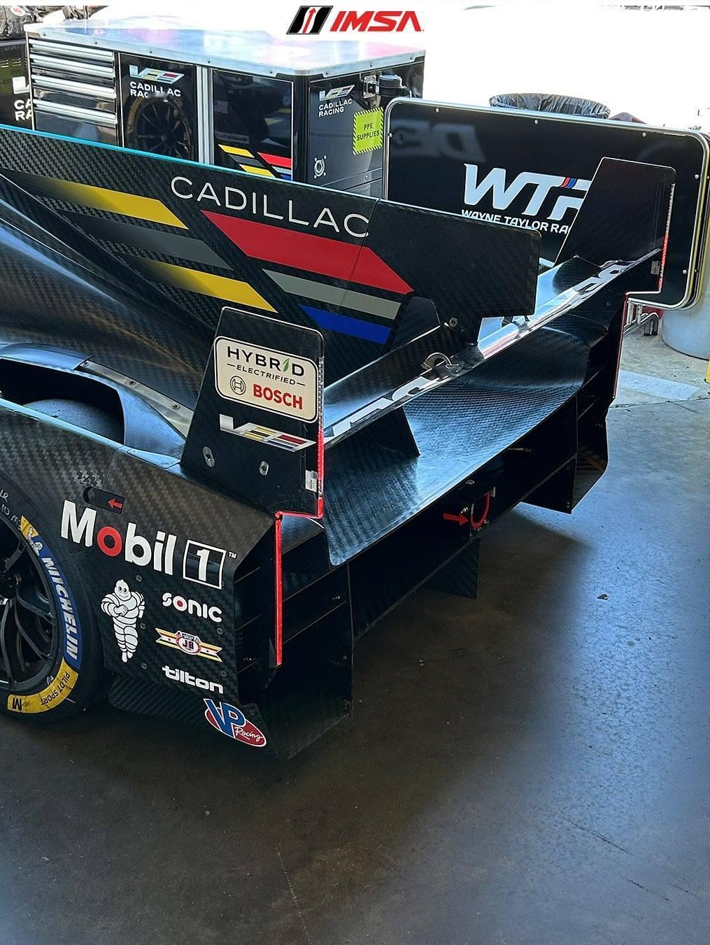 凯迪拉克带来两张EVO牌,解决老款的问题👀凯迪拉克终于带来了彻底的空动EVO版本,与同属达拉拉的宝马彻底划清界限(图4),如今两款车的空动截然不同,宝马的主要改变在前分流器,而凯迪拉克主要集中在尾部,当然车头也有一定的改动❌这台车是所有Hypercar中阻力最大的,当然也是下压力最大的,在一些赛道速度很快,但在勒芒这样的高速赛道缺乏缠斗能力,直线难以守住位置,今年勒芒凯迪拉克尝试了两种截然不同的调校,但低阻力设置在弯道中的速度不尽人意同时这款车在乱流中也难以跟住前车,赛车性能对车身高度和姿态变化过于敏感,需要保持较低的车身才能发挥全部潜力去年第一张EVO改了电子系统,今年用了两张EVO(目前加起来3套EVO),首先就是刹车系统,和宝马一样,左右轮存在温度差,刹车盘供应商同样从Carbone Industries更换为Brembo,凯迪拉克的这张牌比宝马晚了一年第二张EVO就是空动牌,前分流器支架有所更改(图1),取消了车头的风刀(图5),前轮拱开口重新设计,尾翼高度明显降低(图2),取消了车尾的格尼襟翼,以及密集的翼片格栅(图3)改变的大部分都是为了减少阻力,尾翼高度降低后,前后轮附近蝙蝠车一样的四块翼片不再保留,防止干扰尾翼的干净气流可调空动套件从车头轮拱上的可调格尼襟翼改成了尾翼(图9),拓宽不同赛道的可调范围