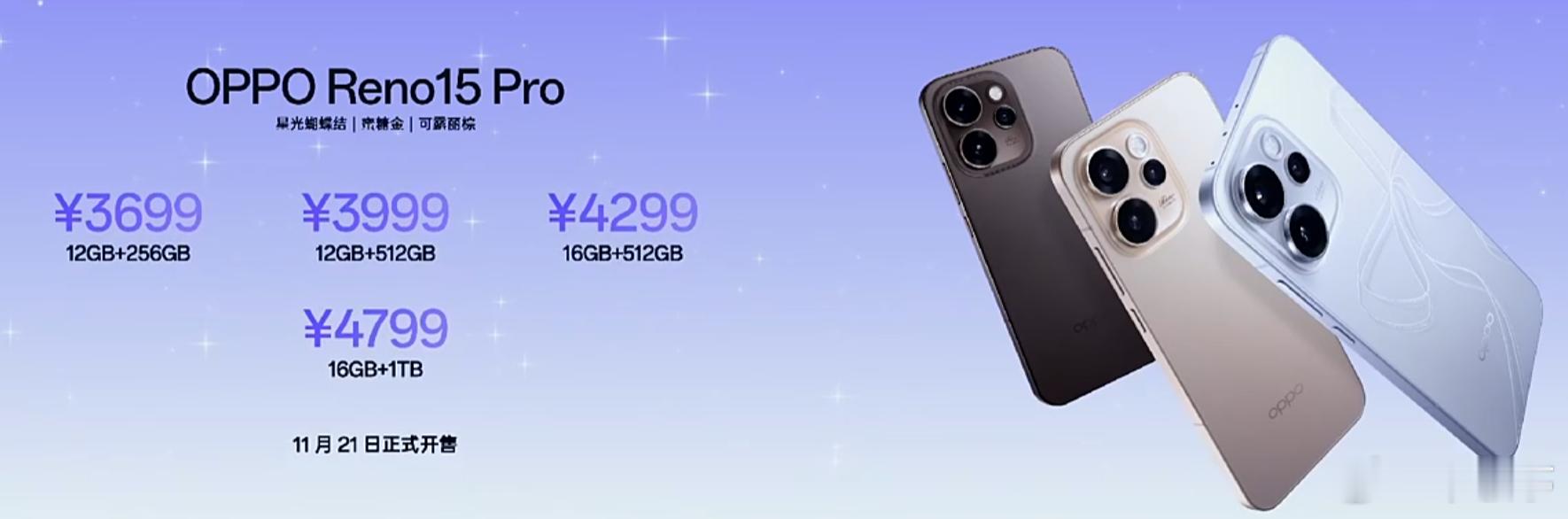 系列价格来了,OPPO Reno15 标准版:【12GB+256GB】版本,定价 2999 元。【16GB+256GB】版本,定价 3299 元。【12GB+512GB】版本,定价 3299 元。【16GB+512GB】版本,定价 3599 元。【16GB+1TB】版本,定价 3999 元。OPPO Reno15 Pro:【12GB+256GB】 版本,定价 3699 元。【12GB+512GB】 版本,定价 3999 元。【16GB+512GB】 版本,定价 4299 元。【16GB+1TB】版本,定价 4799 元。11月 21日全渠道正式开售…
