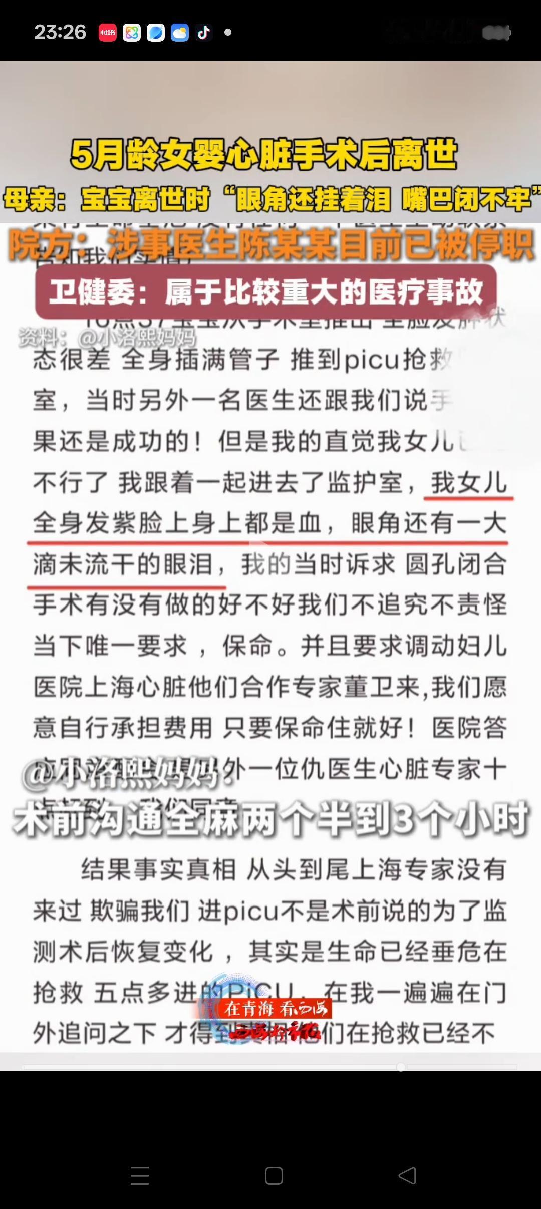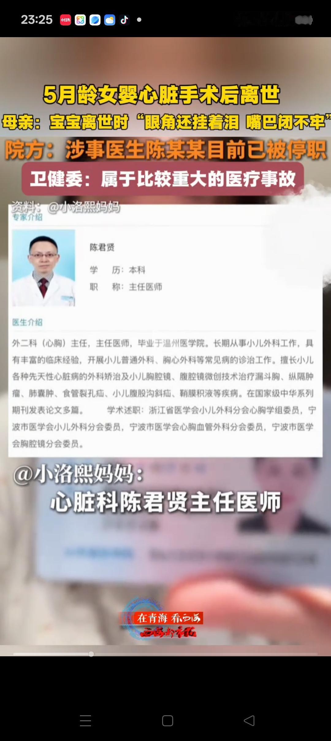 “这事真不怪医生”,宁波,5个月大的宝宝,因为一场心脏手术意外离去。妈妈很气愤,实名举报医生,认为是他的失误才导致的。本来答应的麻醉2-3小时,最后做了7个小时。 凭良心讲,5个月大,又是心脏手术。除非特别有经验的医生,一般的医生可能都不敢100%保证。这个医生敢接,是值得鼓励的,但还是应该谨慎一些的 对于家长,其实也有更稳妥的选择。应该把她带到大城市最好的医院去治疗,或者等到3岁以后,那样相对风险要小一些,可惜妈妈大意了。 妈妈心痛可以理解,但希望也理解医生的不容易,事情肯定要有个清晰的结论,但如果只是小失误,希望能再给他一个机会[祈祷][祈祷]。。