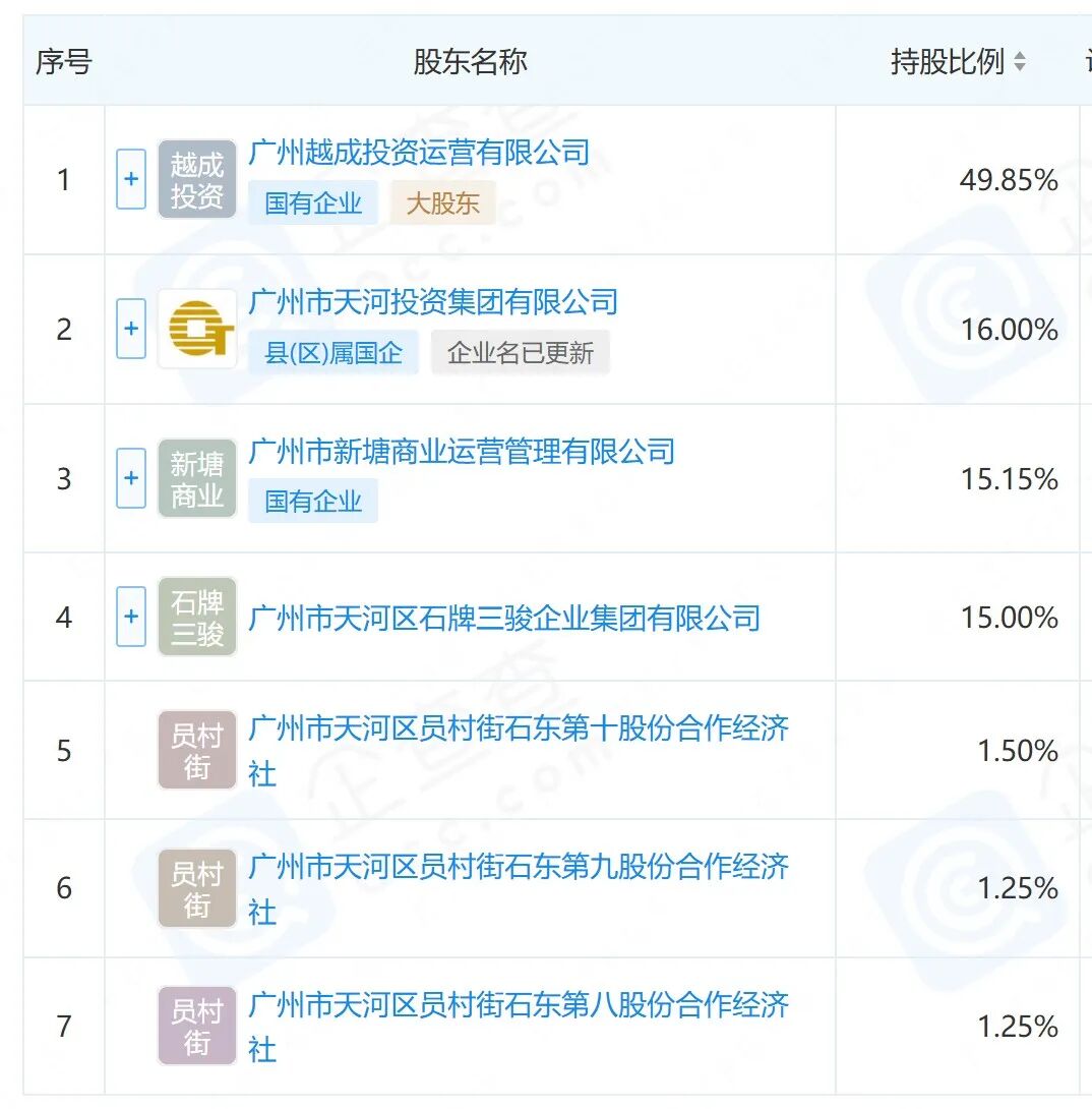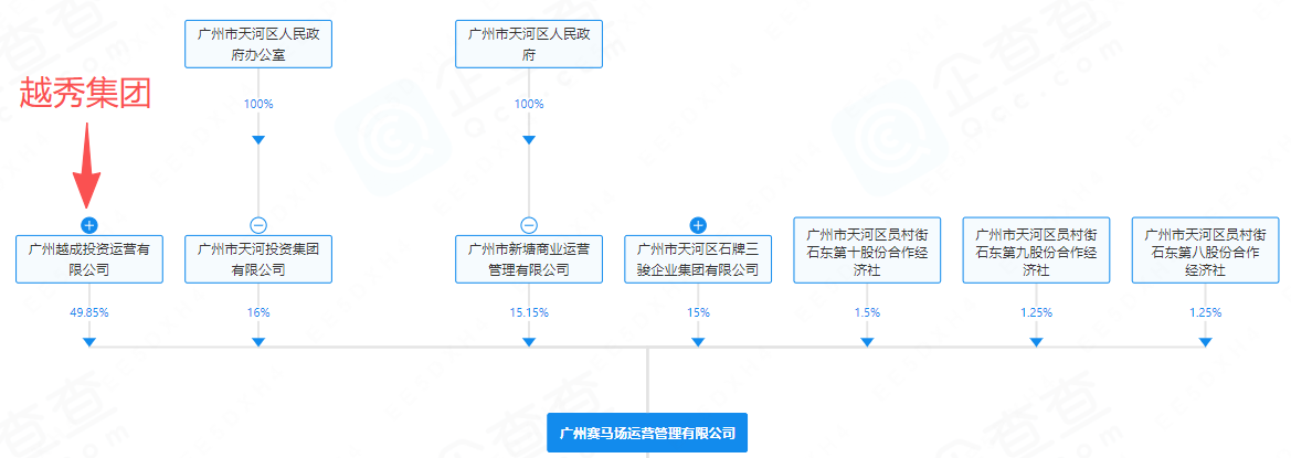 根据企查查信息显示,赛马场运营公司股东主要有7位,第一大股东是越秀集团旗下广州越成投资运营有限公司,持股49.85%;第二、第三大股东是天河投资集团与新塘商业运营管理有限公司,共持股31.15%,背后对应天河区政府。