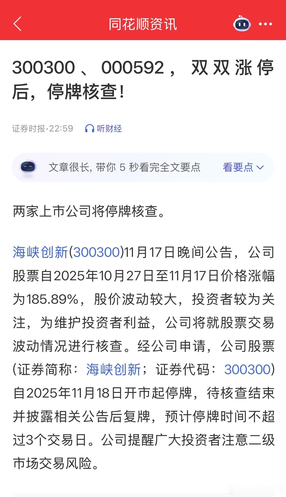 平潭和海峡创新一起停掉,这种是我没有预料到的,说明监管这边还是挺严的,并不支持这种快速的上涨,哪怕你断板再慢慢涨都可以,涨得太快了,还是那句话,你看长城军工,浙江建投这些二波,还有天际股份的三波,都没有这么个涨法,你涨太快了人家肯定要停你,算了,明天锂电池这边看怎么样,锂电池还没有停过
