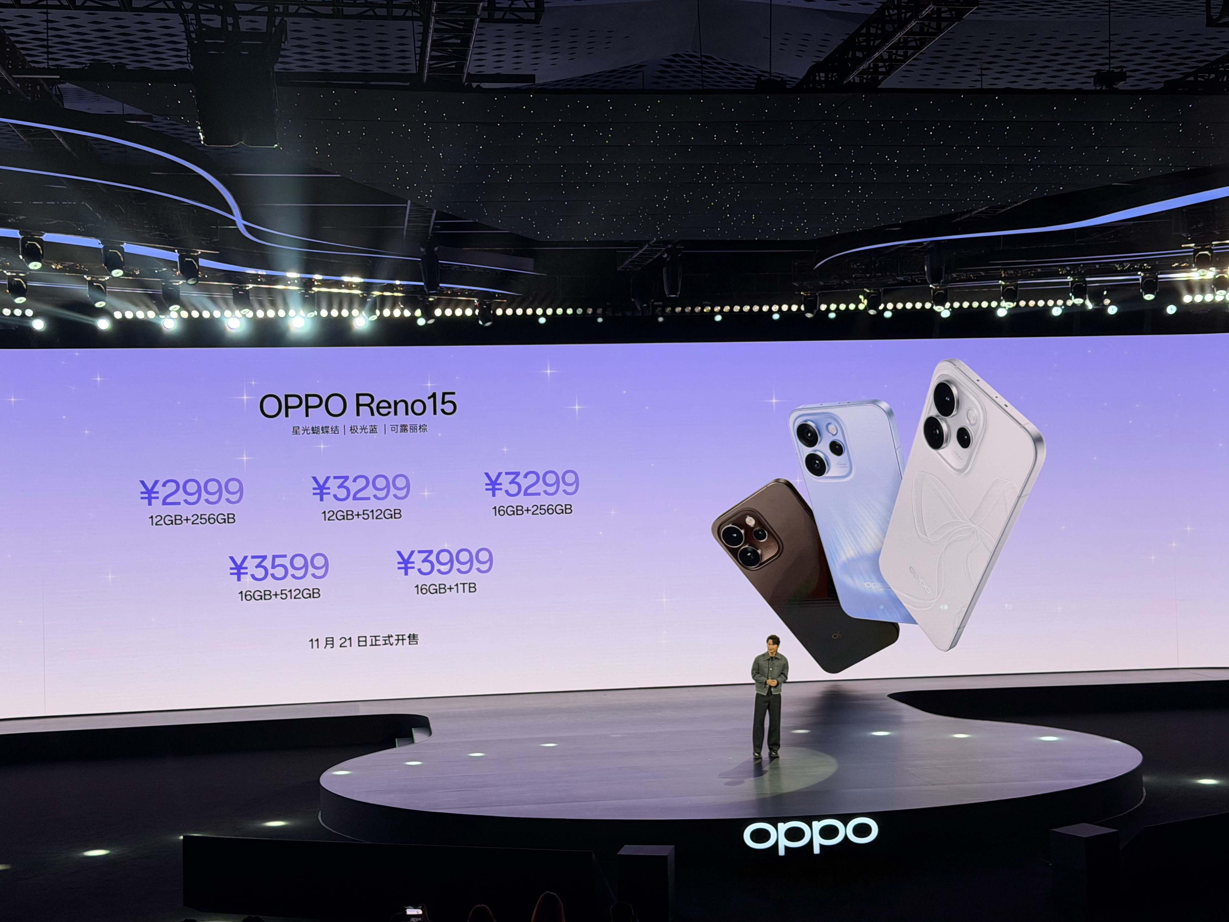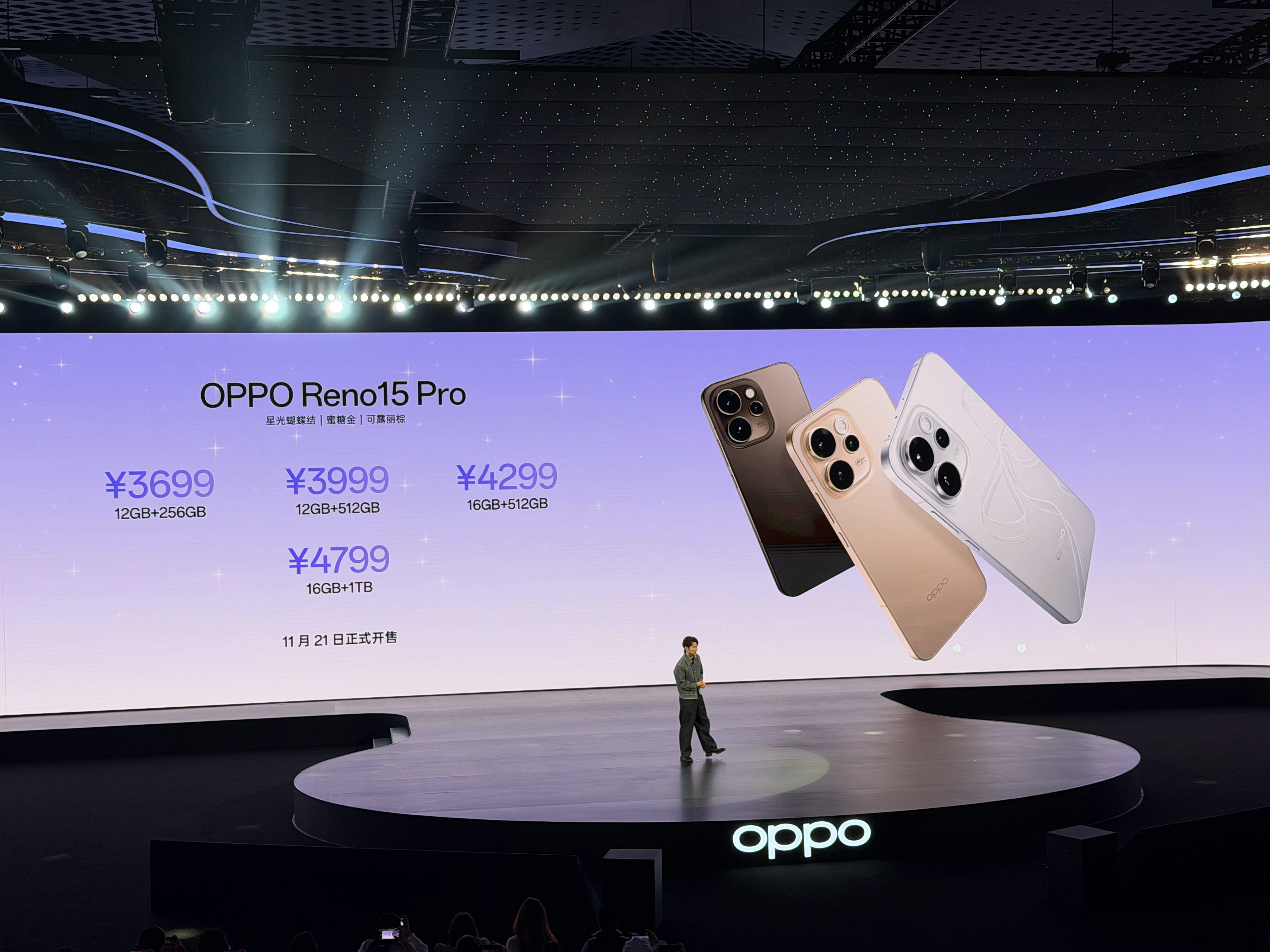 系列价格来了:OPPO Reno15:12+256GB:2999元;12+512GB:3299元;16+256GB:3299元;16+512GB:3599元;16GB+1TB:3999元 ;OPPO Reno15 Pro:12+256GB:3699元;12+512GB:3999元;16+512GB:4299元;16GB+1TB:4799元 ;