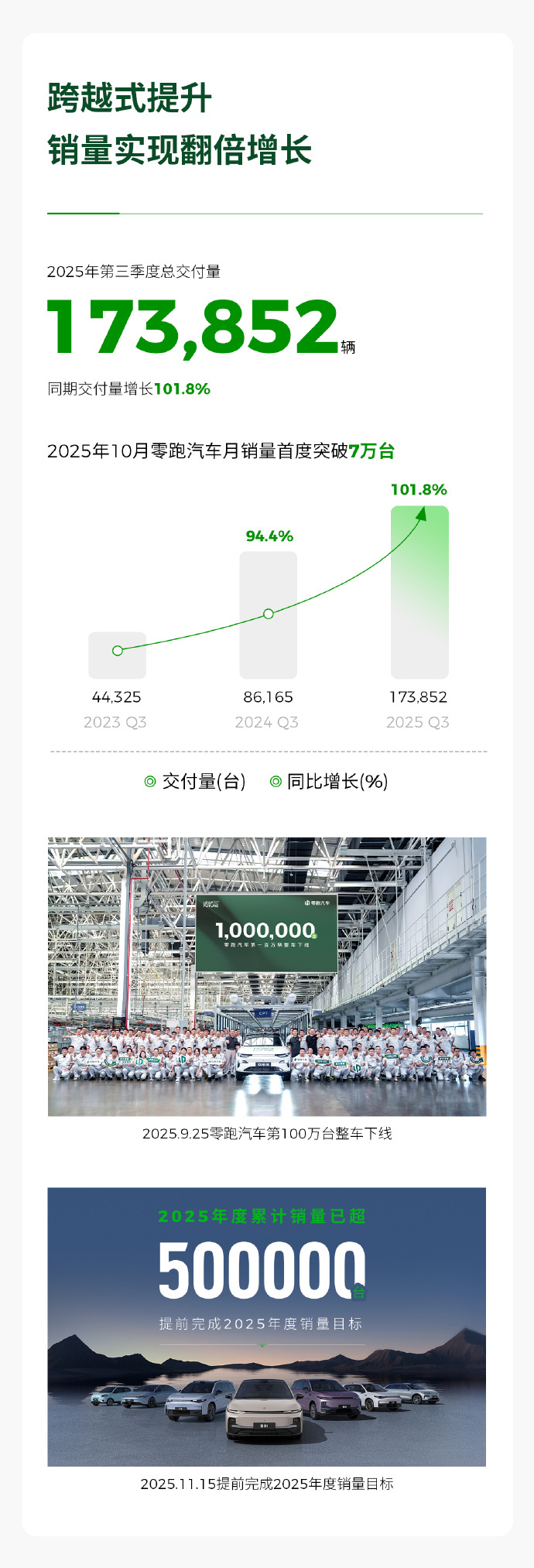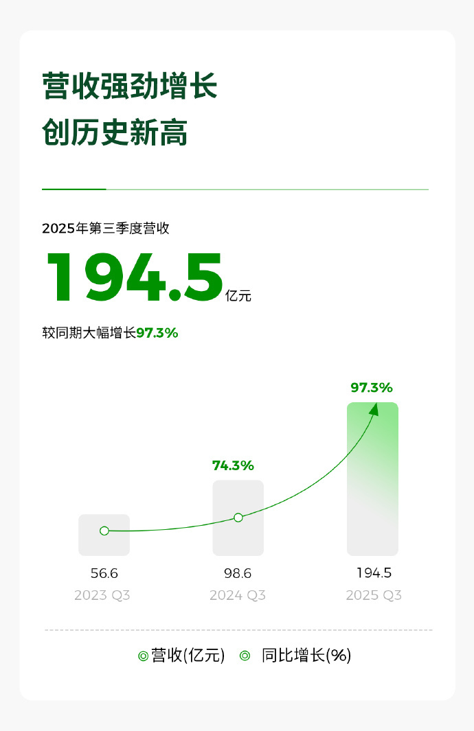 零跑汽车在2025年第三季度展现出强劲的发展势头!财务上,营收达到194.5亿元,同比增长97.3%;毛利率提升至14.5%,同比显著改善;净利润为1.5亿元,连续实现季度盈利,同时公司现金储备充裕,达到339.2亿元。市场表现上,第三季度交付新车173,852台,同比增长超一倍,并已提前完成2025年度50万台的销量目标,稳居中国新势力品牌销量榜首。为实现明年百万台的销量目标,零跑正多措并举。产品方面,完成了ABCD四大产品系列的全面布局,覆盖不同市场区间,新车型Lafa5、旗舰D19等将陆续上市。全球化布局加速,第三季度出口超1.7万台,海外销售网点已超700家,并计划于2026年在马来西亚和欧洲推进本地化项目。此外,零跑公司持续投入技术研发,发布了全新旗舰D平台,并优化销售服务网络,单店效率得到提升。总体来看,零跑汽车通过提升盈利能力、完善产品矩阵、加速全球化扩张和深化技术自研,已进入规模化与盈利良性循环的新阶段,为后续发展奠定了坚实基础。