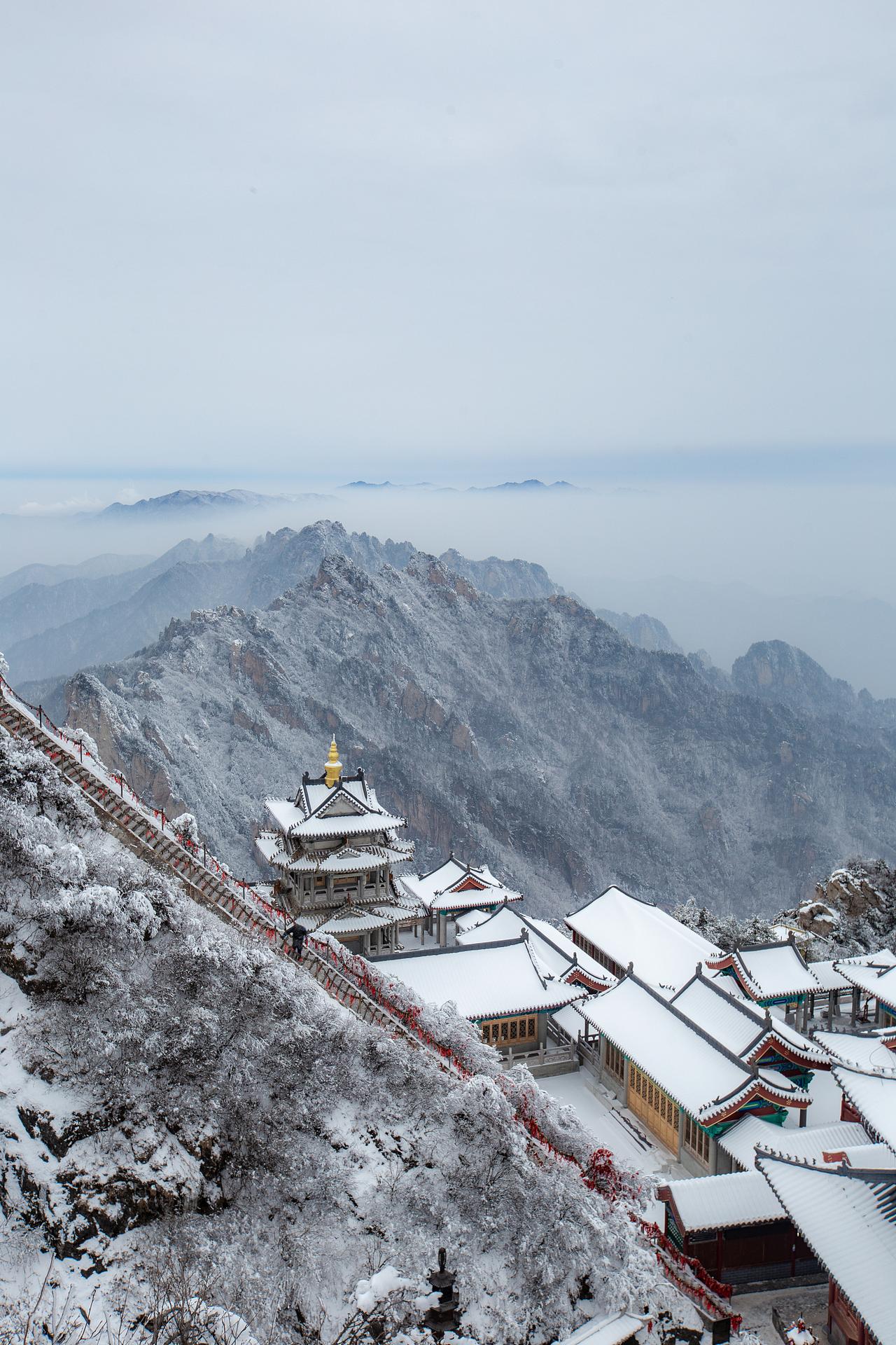 无人机镜头下的老君山彻底变了样!昨天还披着秋色外衣的山峦,今早醒来已满头白发。从高空俯瞰,蜿蜒的栈道像给雪山系上银腰带,金顶道观群的琉璃瓦盖着奶油般的积雪,活脱脱神仙住的冰糖屋。 白云山的松林最有看头,每根树枝都裹着蓬松的雪绒被。风一吹就扬起雪雾,阳光底下闪着细碎的金粉。山脚下的游客早玩疯了,有人把雪堆成两米高的奥特曼,几个穿红衣服的姑娘在打雪仗,笑声惊飞了松树上的积雪团。 景区老王说凌晨四点就带队伍上山铲雪了。最险的悬空栈道要人工一点点刮冰,台阶上撒了五吨防滑料。现在核心步道能走了,但观景台栏杆还挂着冰溜子,提醒游客别趴着拍照。 要说最绝的还是傍晚那会儿。无人机拍下这样的画面:夕阳把云海染成蜜糖色,雪地跟着变成香槟金。山顶道观的灯笼亮起来时,整座山像被施了魔法,连飘落的雪花都带着金边儿。难怪网友说这场雪是老君山给人间的情书,字字句句都写在银装素裹里。 南方小伙伴别光顾着羡慕,河南老铁们早把攻略发上网了。想看雾凇得赶清早,玩雪要戴防水手套,拍延时摄影最好带三脚架。对了,山脚的羊肉汤馆这两天都通宵营业,喝完浑身冒汗再上山,雪地里打滚都不怕冷。