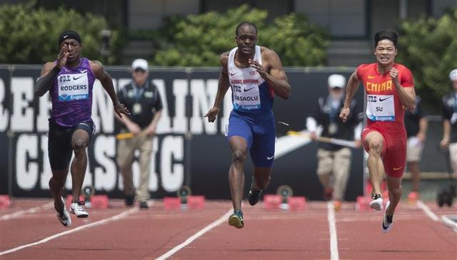 2015年5月31日,在国际田联钻石联赛尤金站男子100米比赛中,中国选手苏炳添以9秒99的成绩获得第三名,打破全国记录。新华社记者杨磊摄