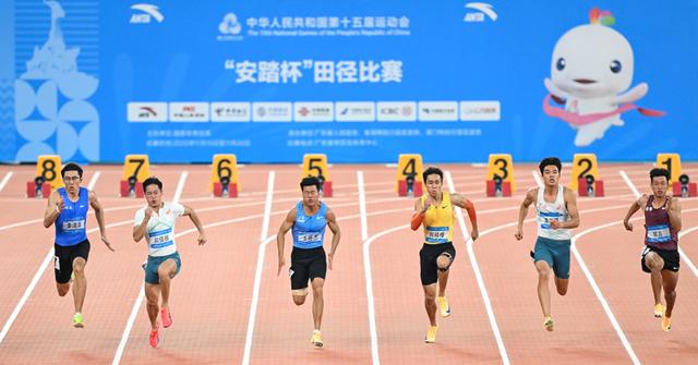 2025年11月17日,第十五届全国运动会田径男子100米决赛在广州举行。新华社记者邓华摄