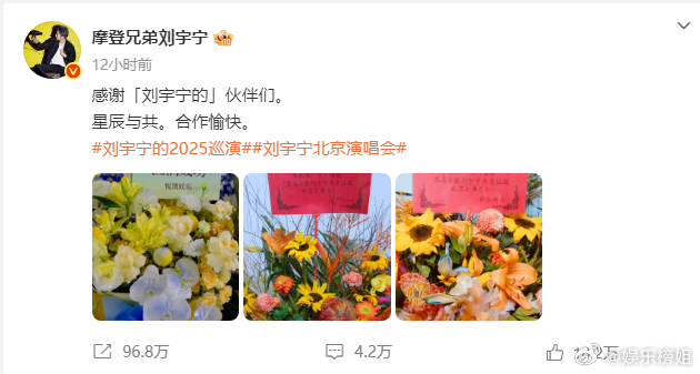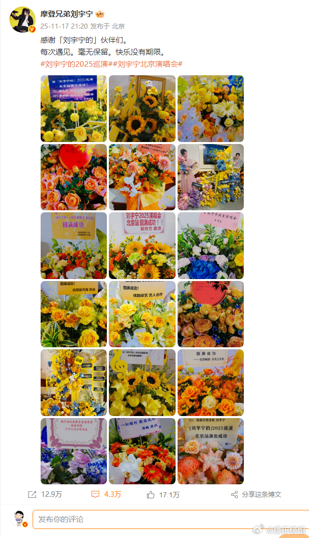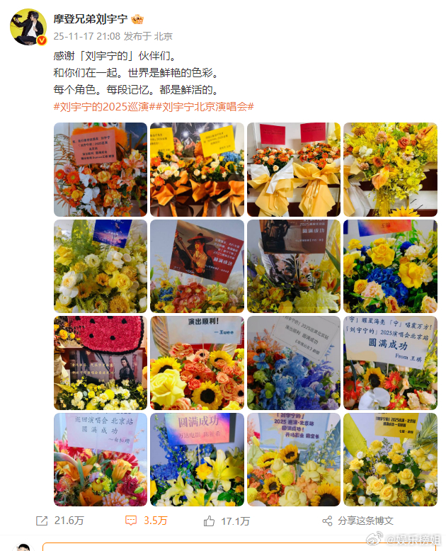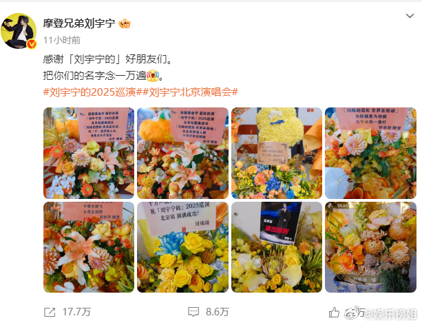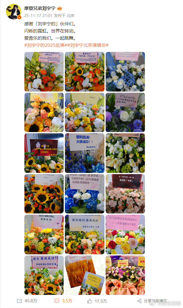刘宇宁晒北京演唱会花篮,连发六条微博感谢家人们,小伙伴们以及好朋友们。大哥真的好