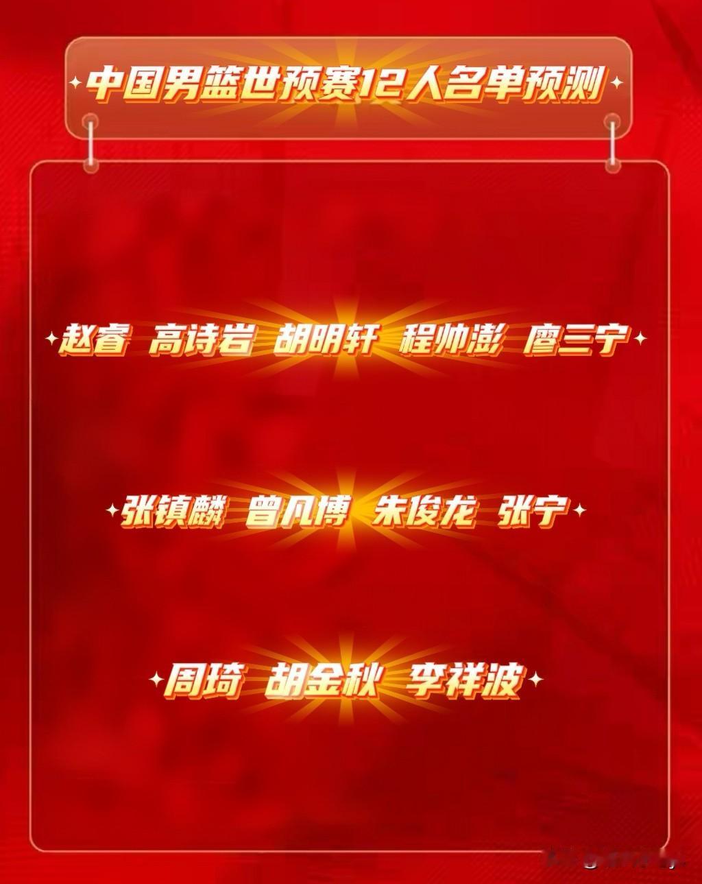 中国男篮世界杯预选赛12人名单即将出炉,我心中也有一份理想名单: ●后卫5名:赵睿、高诗岩、胡明轩、程帅澎、廖三宁。他们在场上组织串联、掌控节奏、防守对位、外线得分方面,都很出色。 ●前锋4名:张镇麟、曾凡博、朱俊龙、张宁。他们身体素质过硬,进攻能力超强,得分手段多样。 ●中锋3名:周琦、胡金秋、李祥波。他们篮下防守和护框强,得分和篮板意识好。 这次世预赛至关重要,中国队要和韩国、日本等队竞争世界杯正赛资格。期待这份理想名单能助力男篮在世预赛取得好成绩。 中国队加油!!! (图片素材来自网络)