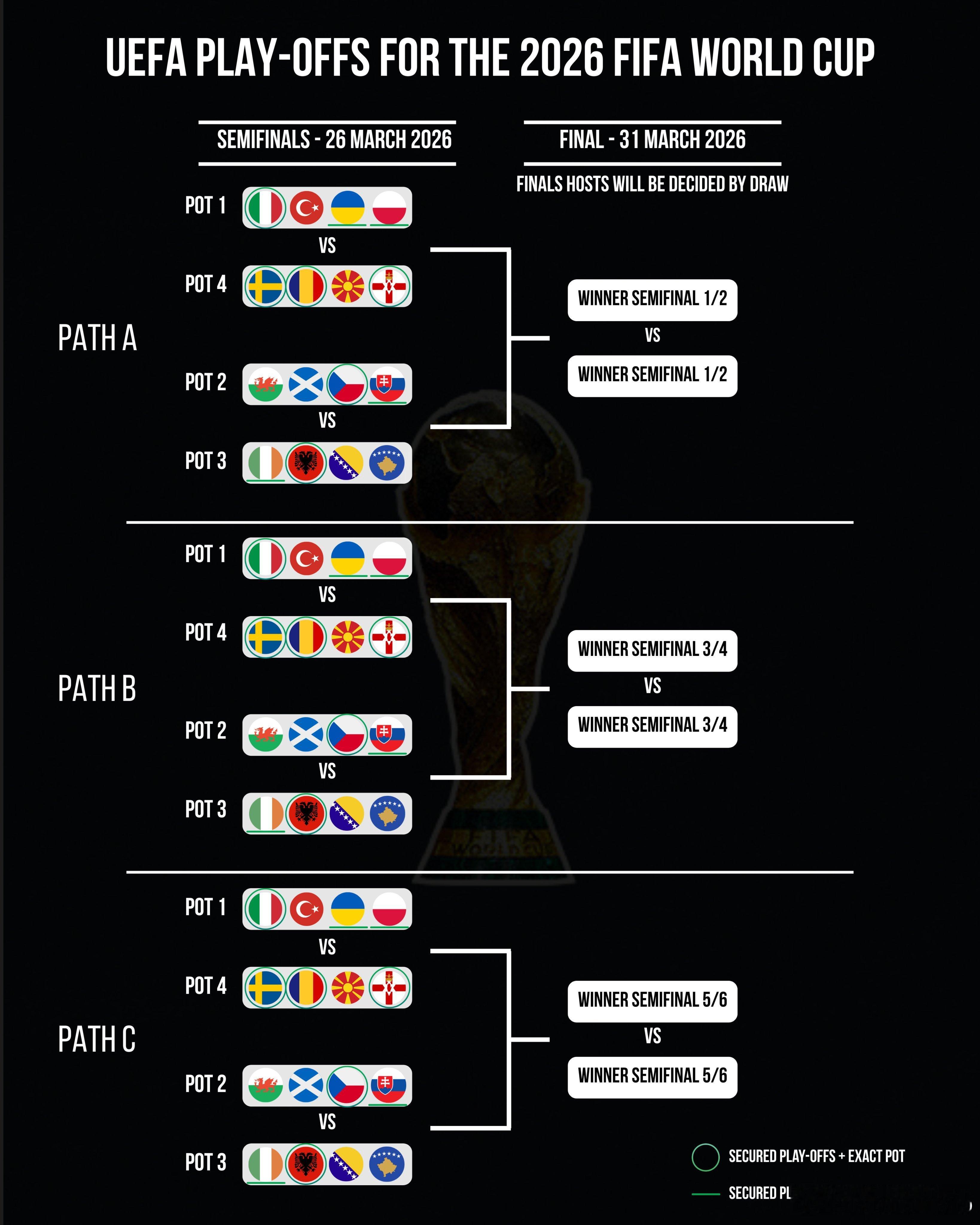 仅需2场,意大利即可时隔12年重返世界杯!💥 4个晋级名额,想去世界杯必须要赢两场。🏟️ 半决赛一档踢四档,二档踢三档。🏡 决赛的主办国将通过抽签决定。🔮 明年3月26日和3月31日开踢。🗓️ 抽签仪式将于11月20日13点(欧洲中部时间)举行。半决赛碰碰瑞典或者北马其顿?破心魔?