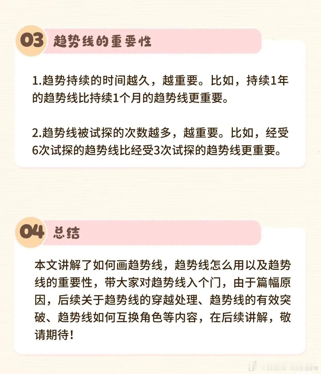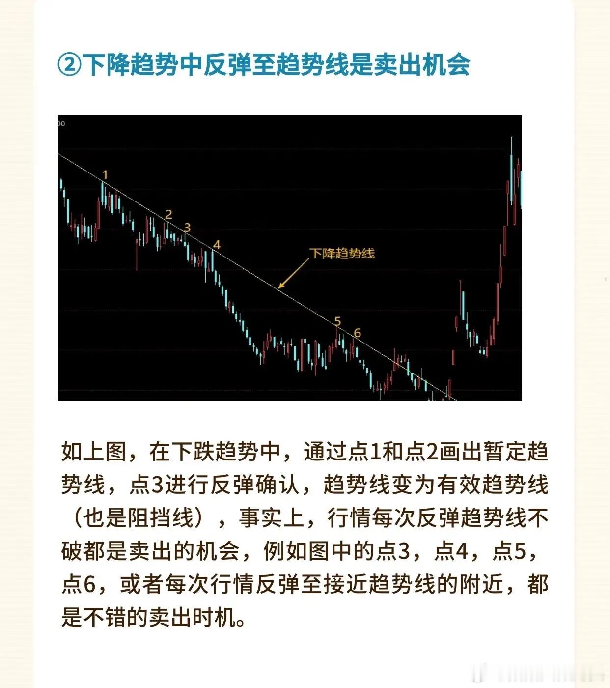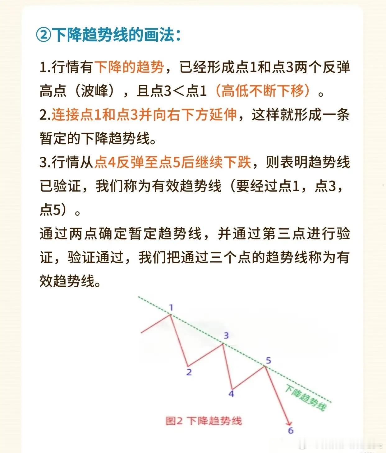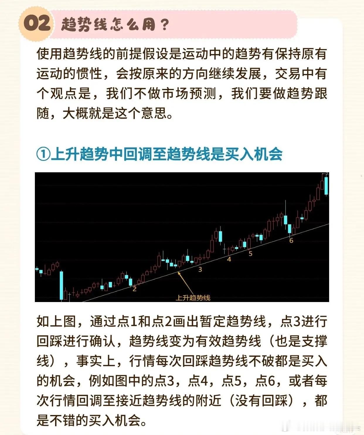 关于股票技术分析中“趋势线入门”的系列教学内容,主要讲解了趋势线的基本概念、画法、使用方法及其重要性,具体内容总结如下:一、趋势线的类型与画法1. 上升趋势线 - 用于描述价格呈现上升趋势的市场。 - 画法:首先找到两个逐步抬高的反作用低点(点1和点3,且点3 > 点1),然后用直线连接这两个低点,并向右上方延伸,形成“暂定上升趋势线”;当价格从后续的一个低点(如点4)回踩并在另一个点(如点5)反弹向上时,说明趋势线得到验证,成为“有效趋势线”。有效趋势线通常经过点1、点3和点5,对价格起支撑作用。2. 下降趋势线 - 用于描述价格呈现下降趋势的市场。 - 画法:先找出两个依次降低的反弹高点(点1和点3,且点3 < 点1),连接这两点并向右下方延伸,形成“暂定下降趋势线”;当价格从低点反弹至某点(如点5)后再度下跌,说明趋势线得到验证,成为“有效趋势线”。有效趋势线通常经过点1、点3和点5,对价格起压制(阻挡)作用。二、趋势线的使用方法1. 上升趋势中的买入机会 - 前提假设:趋势具有惯性,会延续原有方向运行,交易者应做“趋势跟随”而非预测市场。 - 应用:在上升趋势中,当价格回调并触及或接近上升趋势线(支撑线)时,尤其是回踩后不破或接近未破时,是较好的买入时机。例如,价格在点3、点4、点5、点6等位置回踩趋势线后反弹,都是潜在买入点。2. 下降趋势中的卖出机会 - 应用:在下降趋势中,当价格反弹并触及或接近下降趋势线(阻挡线)后无法突破并再次下跌时,是较好的卖出时机。例如,价格在点3、点4、点5、点6等位置反弹至趋势线附近后回落,都是潜在卖出点。三、趋势线的重要性1. 时间因素:趋势持续的时间越长,其对应趋势线的重要性越高。例如,持续一年的趋势线比仅持续一个月的趋势线更加重要。2. 测试次数:趋势线被价格测试(触及或接近但未突破)的次数越多,其重要性也越高。例如,被测试六次的趋势线比只被测试三次的更关键。四、总结与展望- 本系列教学初步讲解了趋势线的定义、绘制方法(包括上升和下降趋势线)、在交易中的实际应用(作为支撑与阻挡)、以及判断其重要性的依据。- 内容涵盖了从基础画法到实战应用,帮助学习者建立对趋势线的入门理解。- 后续还将进一步探讨趋势线的穿越处理、有效突破的判定、以及趋势线角色互换等相关进阶内容,敬请期待。这套内容适合股票或其他金融产品的技术分析初学者,通过图文结合的方式,直观地展示了趋势线在趋势判断与交易决策中的基础作用。