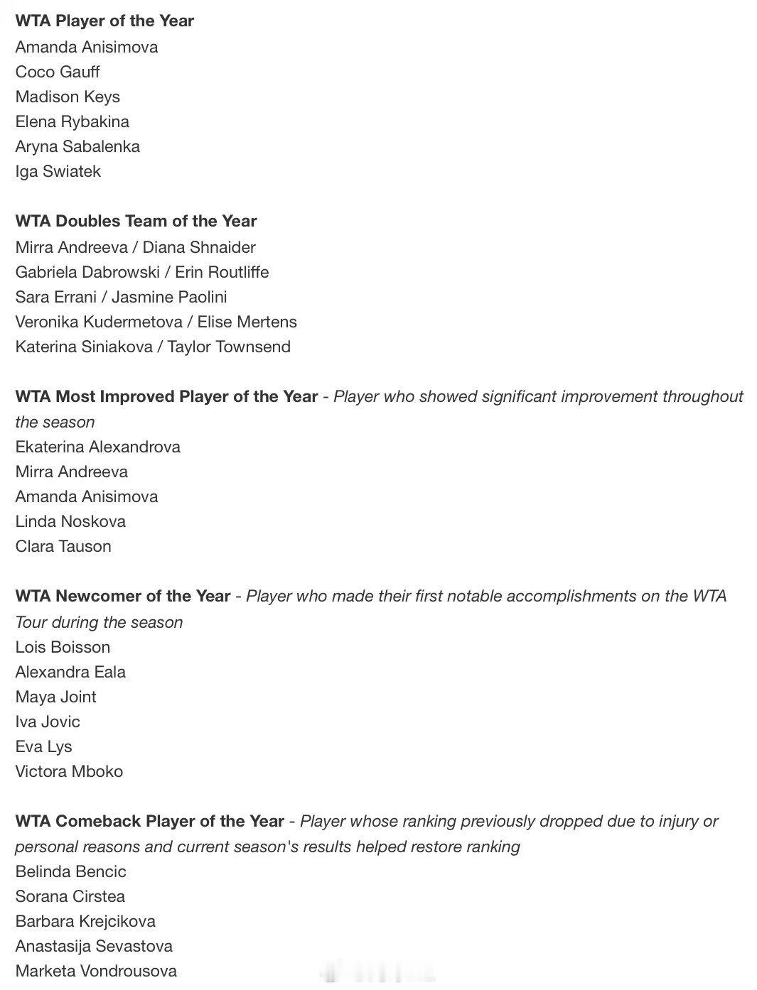 2025年WTA年度奖项提名名单年度最佳球员:斯瓦泰克、萨巴伦卡、阿尼西莫娃、莱