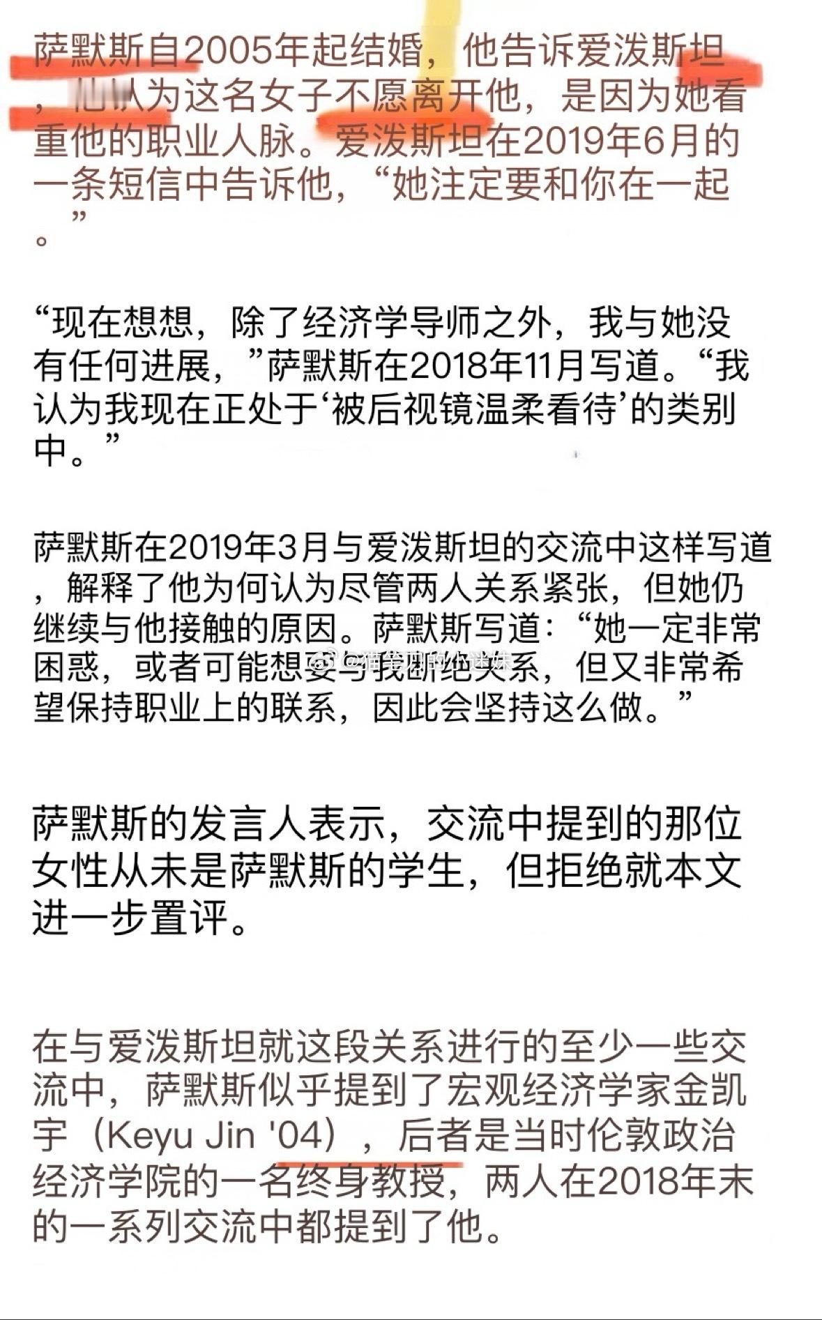 萨默斯:曾任美财长,哈佛校长,世界银行首席经济学家。AI省流:这段文字揭示了萨默斯在 2018 年底至 2019 年中与爱泼斯坦讨论了他如何与一位女弟子发展婚外关系后,他将退出公共职务。文章暗示这位女性可能是经济学家金刻羽,但萨默斯的发言人否认她是萨默斯的学生。