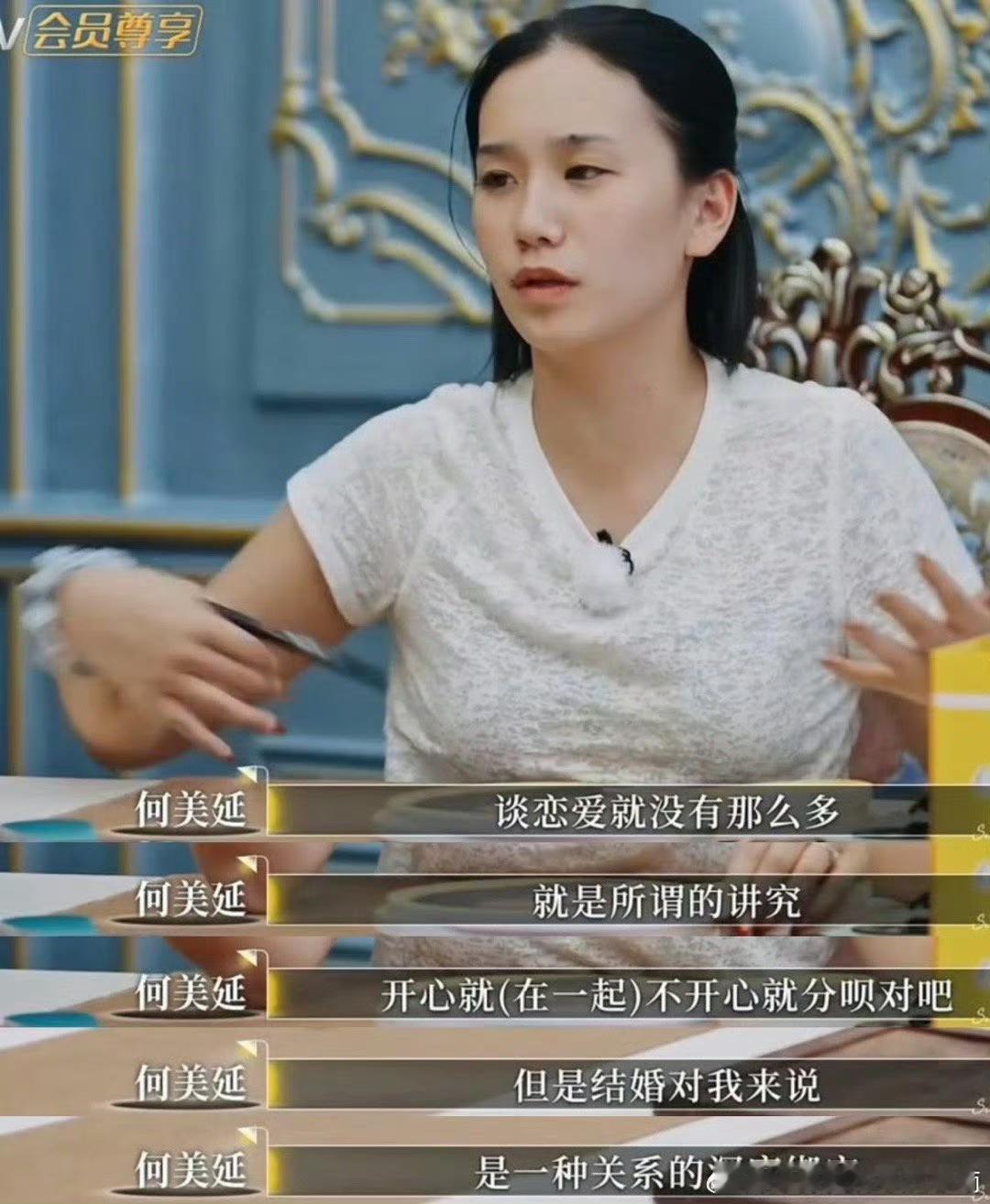 何美延, 所有女性都在共情你的情绪和认可你的能力,你要发光! 何美延,你的天空不该只有争吵的屋檐,papi酱说:“如果没有镜头,我们会认为何美延是一个“疯”女人”,你会后悔在凌晨川流不息的吵架吗? 可明明你也是个很优秀的人,梁淞说“我们吵架那肯定是她厉害,很会找关键词”,你自己也说:“我记忆力很好”,运动世家,跑步很快,虽然梁淞把导游手册弄丢了,可大家还是玩的很好,林心如也说:“计划都在美延脑子里了”。 你看你,逻辑思维能力强,能听懂能快速做出改变,倪萍夸你:“一个人能有反思自己的能力,是最聪明的人”,观察室的哲学系教授刘擎也夸你:“美延真的是很聪明的人”。 梁淞总提她原生家庭,说她自卑的时候,各种贬低的时候,当着陌生人的面,当着大家的面这么说的,我有时候都觉得何美延真的太包容了。 但何美延你真的很牛,被这种丈夫和婚姻消耗那么多年,依然没有放弃她的自我意识。换做别人,可能会被慢慢消磨掉棱角,放弃自我不再挣扎。但她没有!你不停地争吵争辩,就是你没有放弃自己的证明! 何美延,把时间放在搞事业上吧,你有太多的优点了,从你的节目里,你的闪光点,不止一个人看到,这是命运给你的重要机会,抓住,抓不住以后你可能被磨到失去光彩。