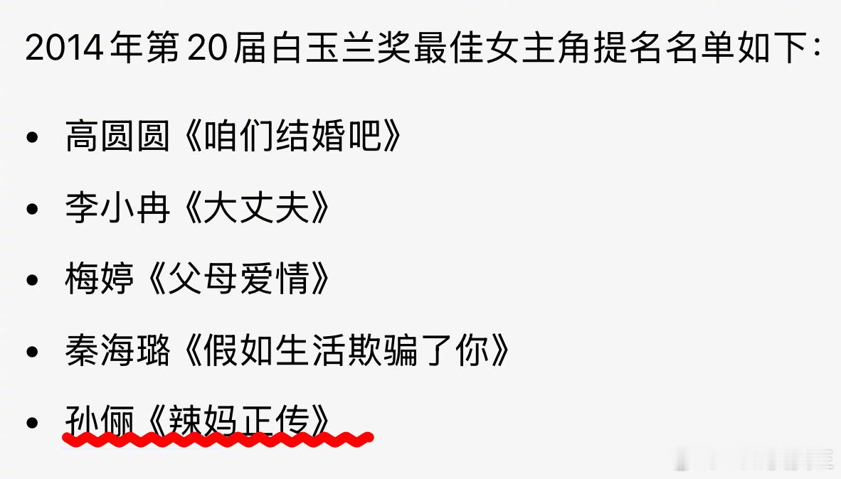 白玉兰史上,最可惜的是《父母爱情》0获奖,梅婷无缘视后吧?那一年,梅婷最终输给了《辣妈正传》的孙俪……而网友纷纷猜测,可能是为了弥补之前孙俪《甄嬛传》错过的视后,而之前打败孙俪《甄嬛传》视后的,正是宋佳的《悬崖》……说到底,孙俪一来一回,也不算亏,最可惜的只有梅婷吧?