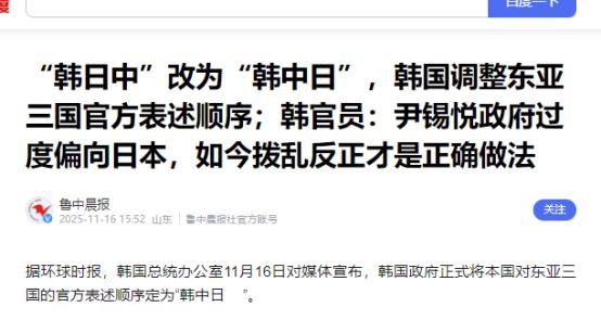 韩国总统正式宣布了 11月16日,韩国总统府正式对外宣布,将东北亚三国的官方表述顺序统一规范为“韩中日”。 韩国总统府青瓦台丢出一颗“精致”的外交烟雾弹:以后不叫“韩日中”,改口“韩中日”。短短三个字的顺序一换,立马在国际舆论场掀起一股小旋风。 不少韩国网友直接在社交平台刷起了“终于改回来了”的话题。他们觉得这事儿早该办,上届政府非要拧着来,纯属给自己找不痛快。 青瓦台发言人在接受采访时说得挺委婉,他表示这个调整是跟着韩国社会的使用习惯走的,“韩中日”本来就是老百姓用得最多的说法,统一之后能避免不少没必要的争议。这话听着是讲语言习惯,明眼人都知道没这么简单。 这事儿得往前倒腾两年。前总统尹锡悦在任的时候,韩国政府突然就把老祖宗传下来的“韩中日”改成了“韩日中”。当时总统府的说法很直接,就是要突出韩日之间“更紧密的合作”。那会儿尹锡悦政府一门心思跟着美国跑,和日本凑得特别近,连历史问题都敢松口,改个称呼不过是配套动作之一。 可这套操作让韩国自己吃了不少亏,中国是韩国最大的贸易伙伴,去年两国贸易额比韩日贸易额多出整整三成。尹锡悦政府偏着日本的那套外交,让不少韩国企业丢了中国订单。 现在李在明政府刚上台就改回老称呼,说白了就是拨乱反正。总统府里有官员私下说得更实在,外交的关键是平衡,前政府搞意识形态外交,把天平完全压向日本,本身就跑偏了。把顺序改回来,才是回到正确的轨道上。 这个小小的调整,其实是给中国递了个友好信号。韩联社直接点破,这就是李在明政府务实外交的体现,核心就是要改善对华关系。毕竟光靠美国和日本,撑不起韩国经济的半边天。韩国的半导体、化妆品、汽车三大支柱产业,哪一个都离不开中国市场。 日本那边的反应就有点微妙了,共同社特意发了篇报道,字里行间都透着不自在,却没敢说硬话。他们清楚,现在的韩国不再是尹锡悦当政时的“小跟班”,李在明政府要的是平衡,不是选边站。真把韩国惹急了,受损的是日本的汽车和电子产品出口。 还有更有意思的细节,韩国政府这次没搞大张旗鼓的仪式,就通过总统府官员接受电话采访的方式公布了消息。这种低调处理的方式,既传递了外交态度,又没把事情闹得太僵,给足了美日面子。 有韩国外交专家分析,这个称呼变化只是开始。接下来韩方很可能会主动邀请中国开展高层互访,还会在经贸合作上放出更多利好。毕竟上届政府的教训摆在那儿,靠押宝某一方搞外交,最终只会砸了自己的脚。 对普通老百姓来说,称呼顺序改不改好像没多大影响。但在外交场上,这三个字的分量重着呢。它藏着一个国家的战略考量,也映着三国关系的冷暖变化。韩国把“中”字挪回前面,本质上是认清了现实——在东北亚这片地界上,和中国搞好关系,才是最实在的选择。 后续就看日本怎么接招,还有中韩之间能不能借着这股势头,把之前的合作障碍再扫掉一些。这个小小的称呼调整,说不定会成为东北亚关系缓和的一个新起点。 来源:鲁中晨报