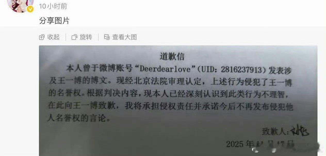 侮辱诽谤王一博网友致歉,该网友将承担侵权责任并承诺今后不再发布侵犯他人名誉权的言论。