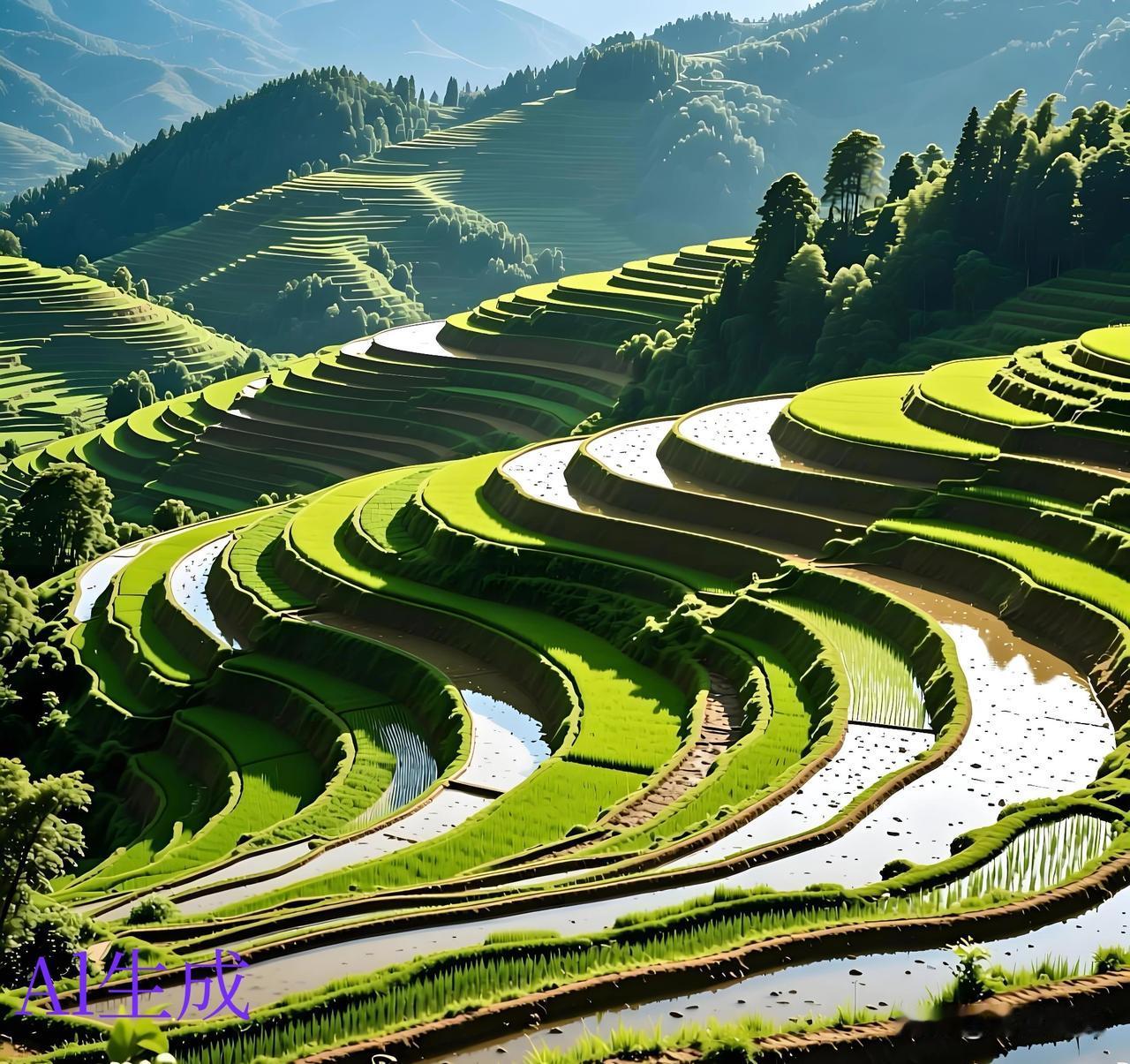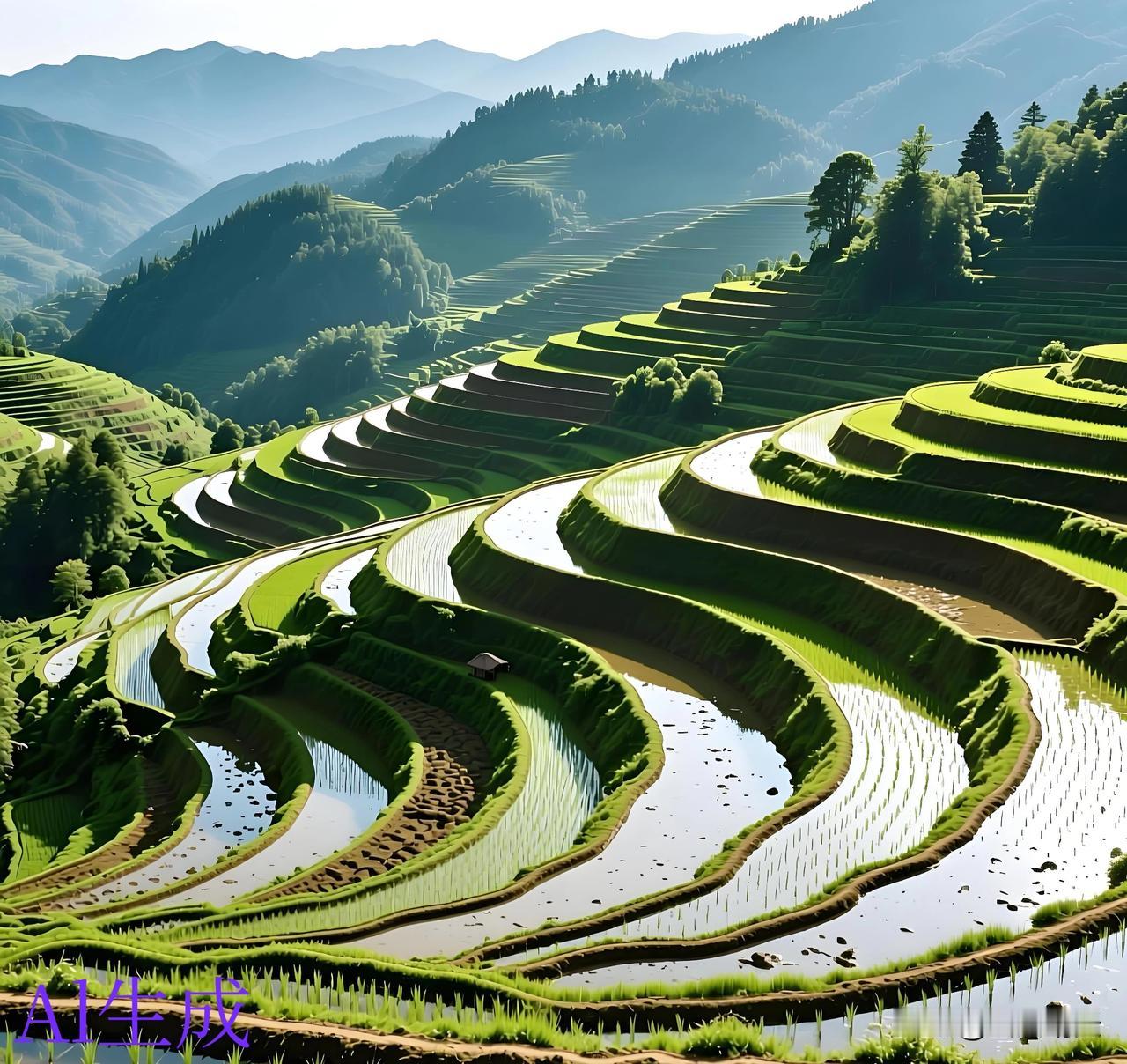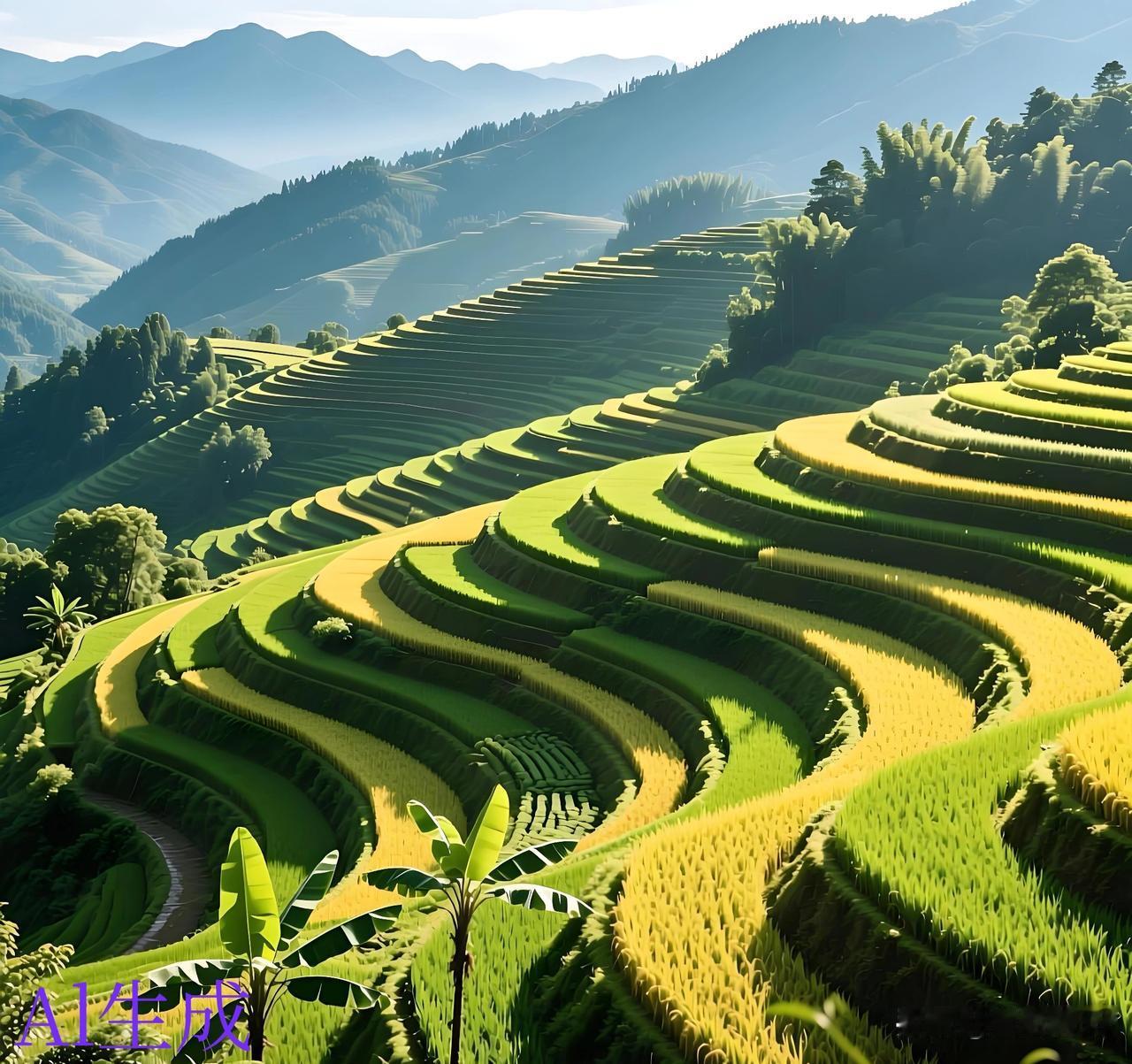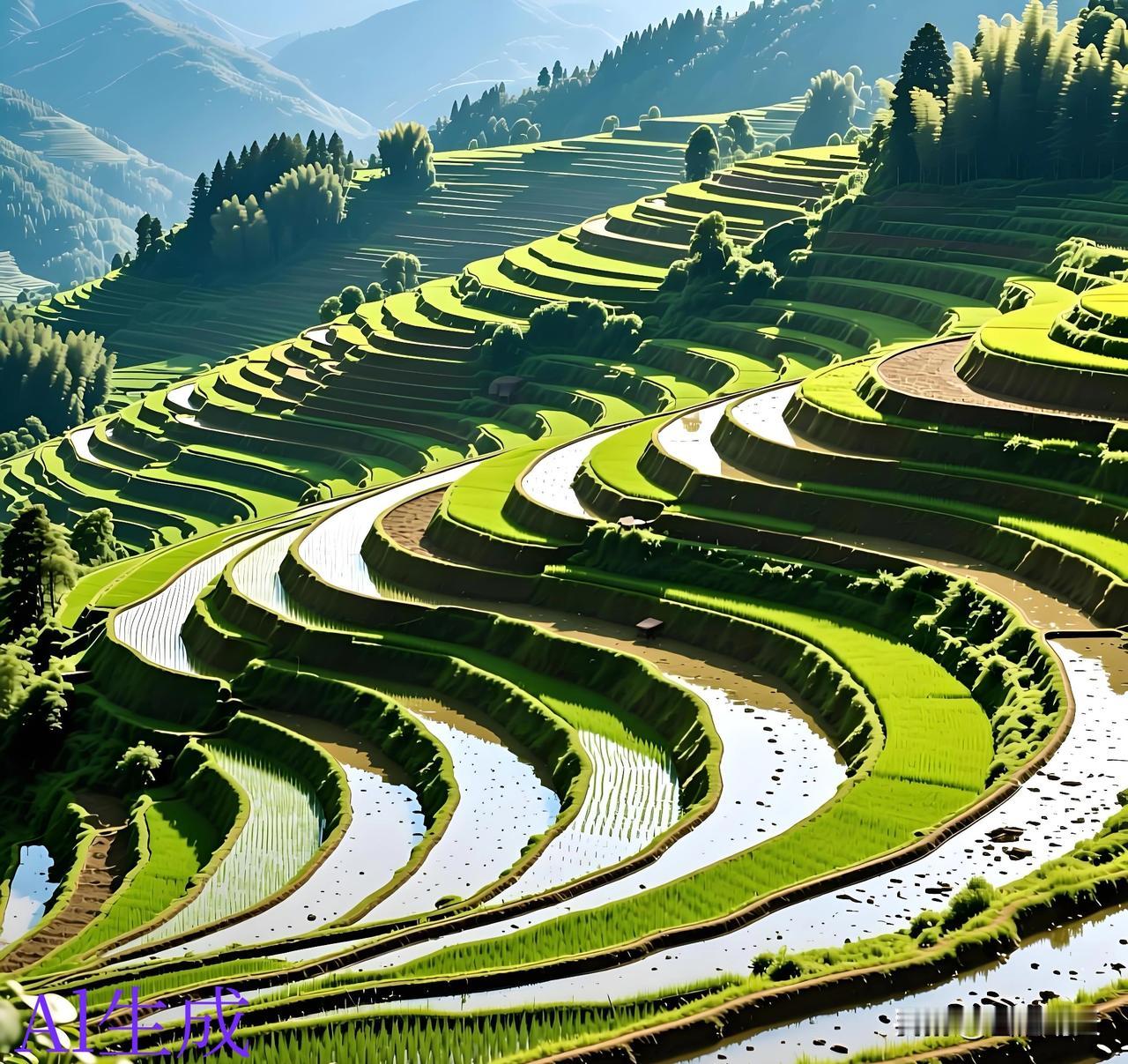层层叠叠的梯田 看起来真是美观。 美则美矣、就是农民伯伯种起来会不会特别累? 不知道是这种梯田地种的轻松 还是那种平原种地的轻松。 一层一层像楼梯一样 上面好似铺上一层绿色的地毯。 看着这副美景真是养眼啊!