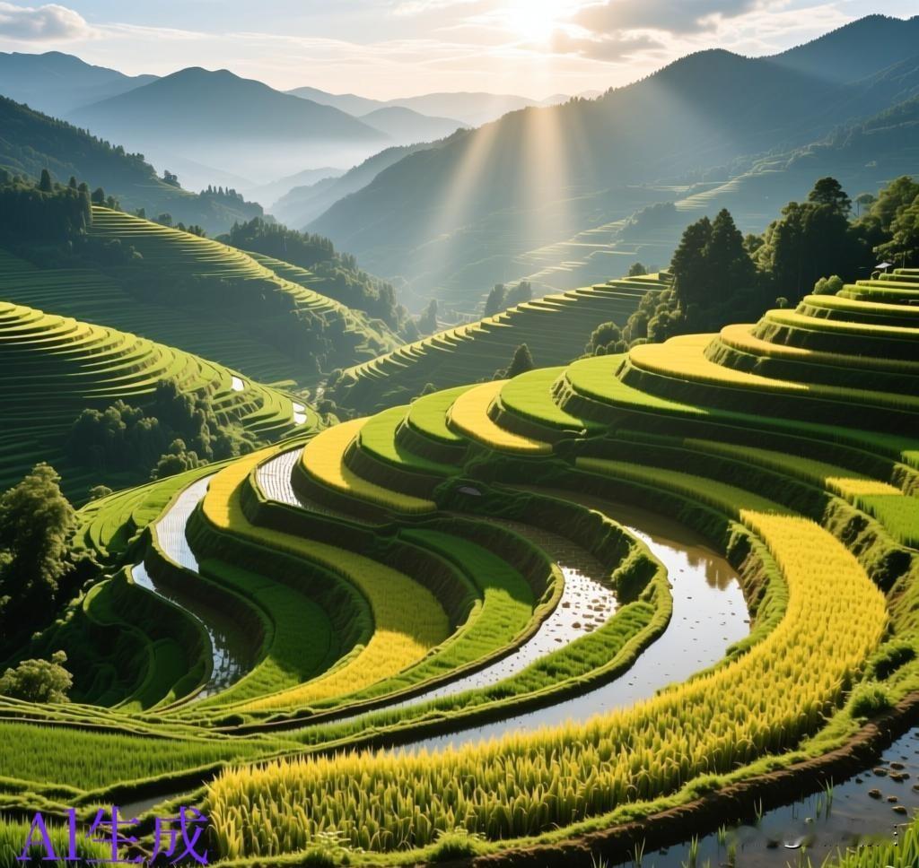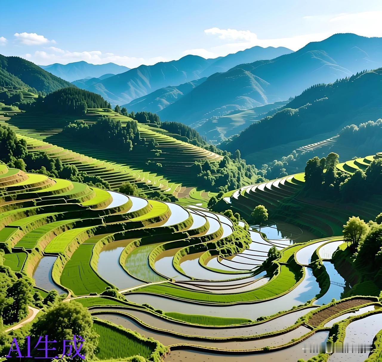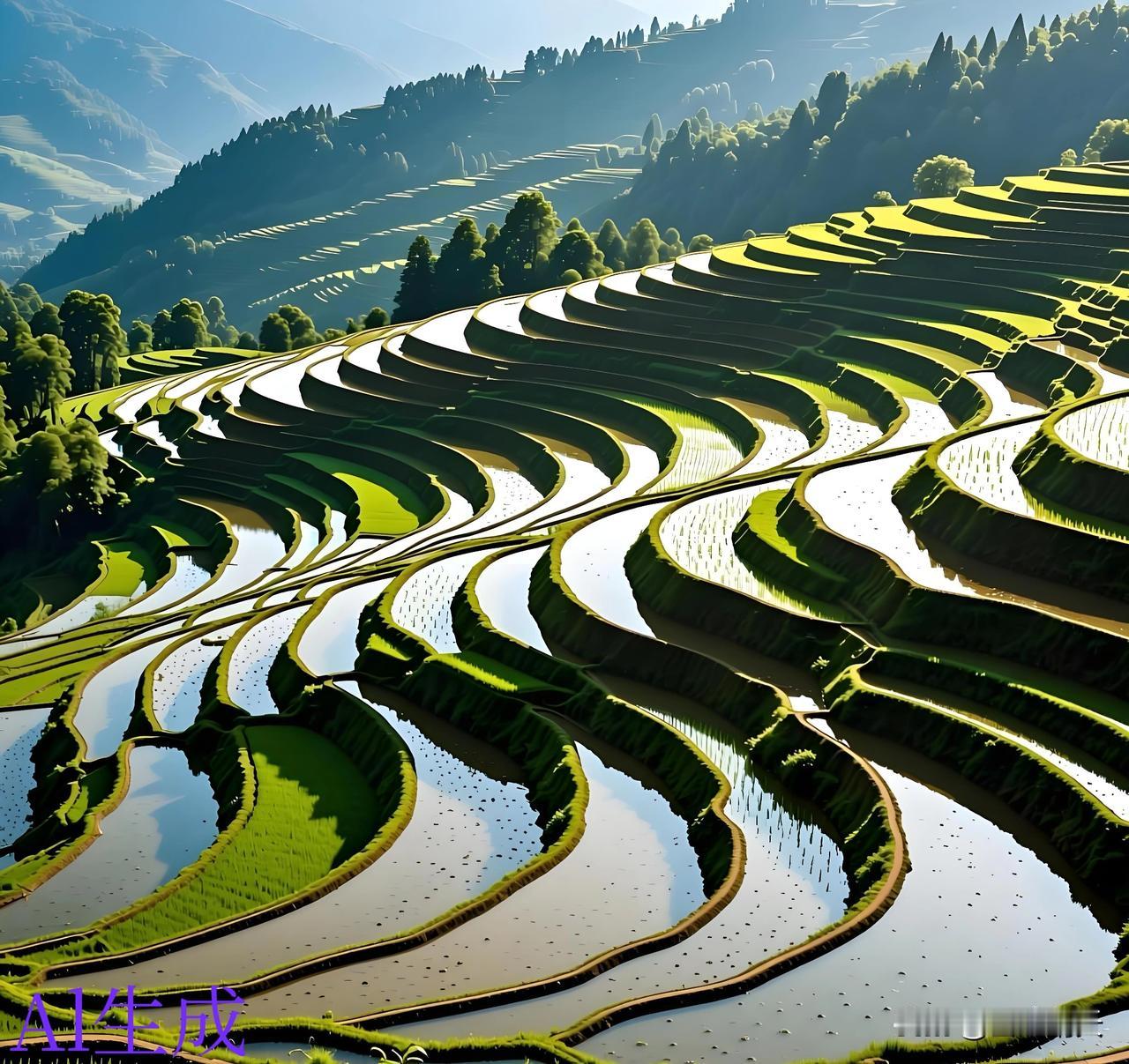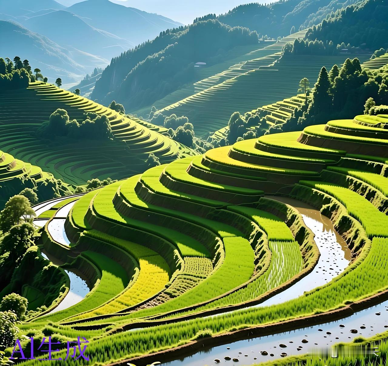 层层叠叠的梯田 看起来真是美观。 美则美矣、就是农民伯伯种起来会不会特别累? 不知道是这种梯田地种的轻松 还是那种平原种地的轻松。 一层一层像楼梯一样 上面好似铺上一层绿色的地毯。 看着这副美景真是养眼啊!