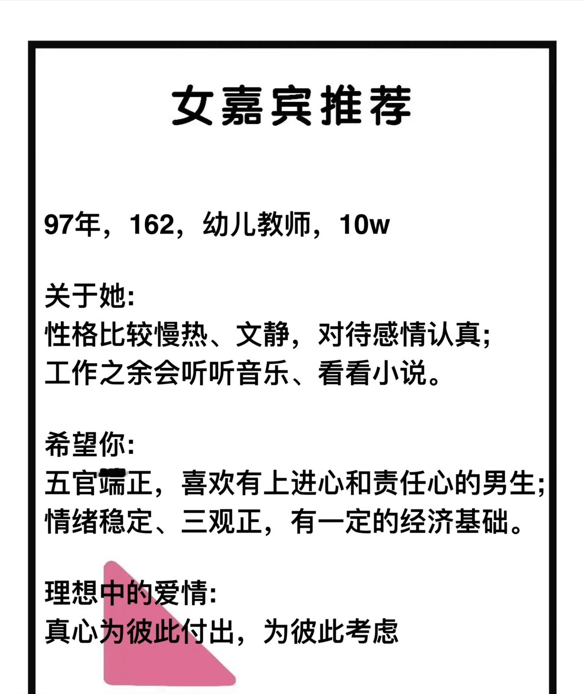 【第7497号】97年女生,身高162,幼儿教师,年收入10;文静慢热,感情专一,喜欢听音乐看小说。希望男生五官端正,情绪稳定,有一定经济基础… 详情戳图↓特约嘉宾——有意者请私信小美,投稿/加群/周末相亲会/小红娘1V1牵线 请私信!