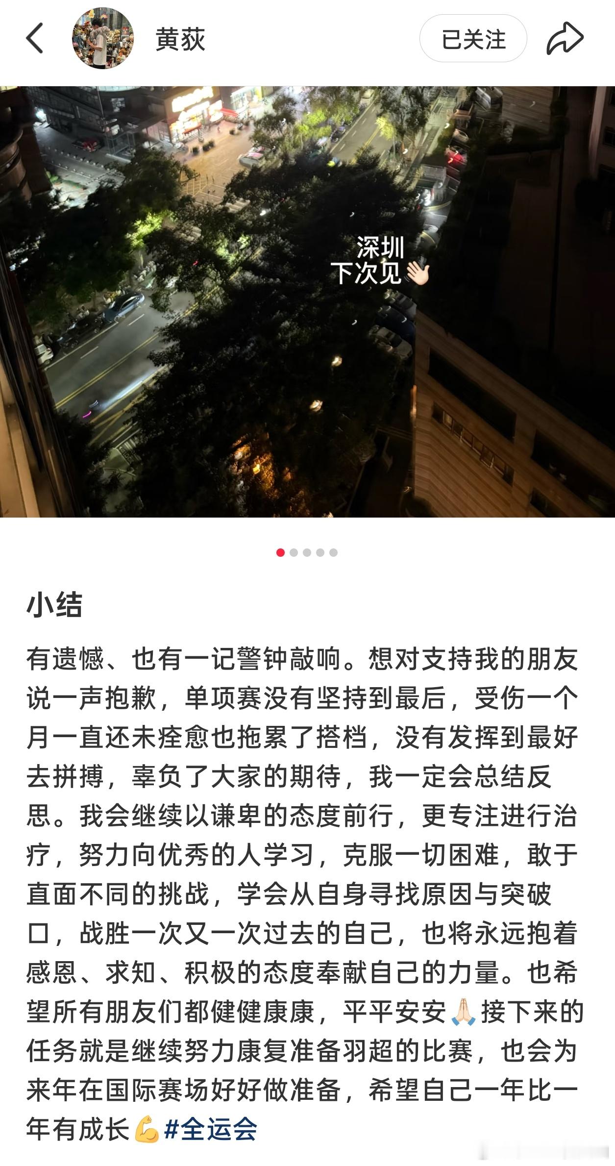 黄荻🍠更新:有遗憾、也有一记警钟敲响。想对支持我的朋友说一声抱歉,单项赛没有坚持到最后,受伤一个月一直还未痊愈也拖累了搭档,更专注进行治疗,努力向优秀的人学习,克服一切困难,敢于直面不同的挑战,学会从自身寻找原因与突破口,战胜一次又一次过去的自己,也将永远抱着感恩、求知、积极的态度奉献自己的力量。也希望所有朋友们都健健康康,平平安安人接下来的任务就是继续努力康复准备羽超的比赛,也会为来年在国际赛场好好做准备,希望自己一年比一年有成长💪