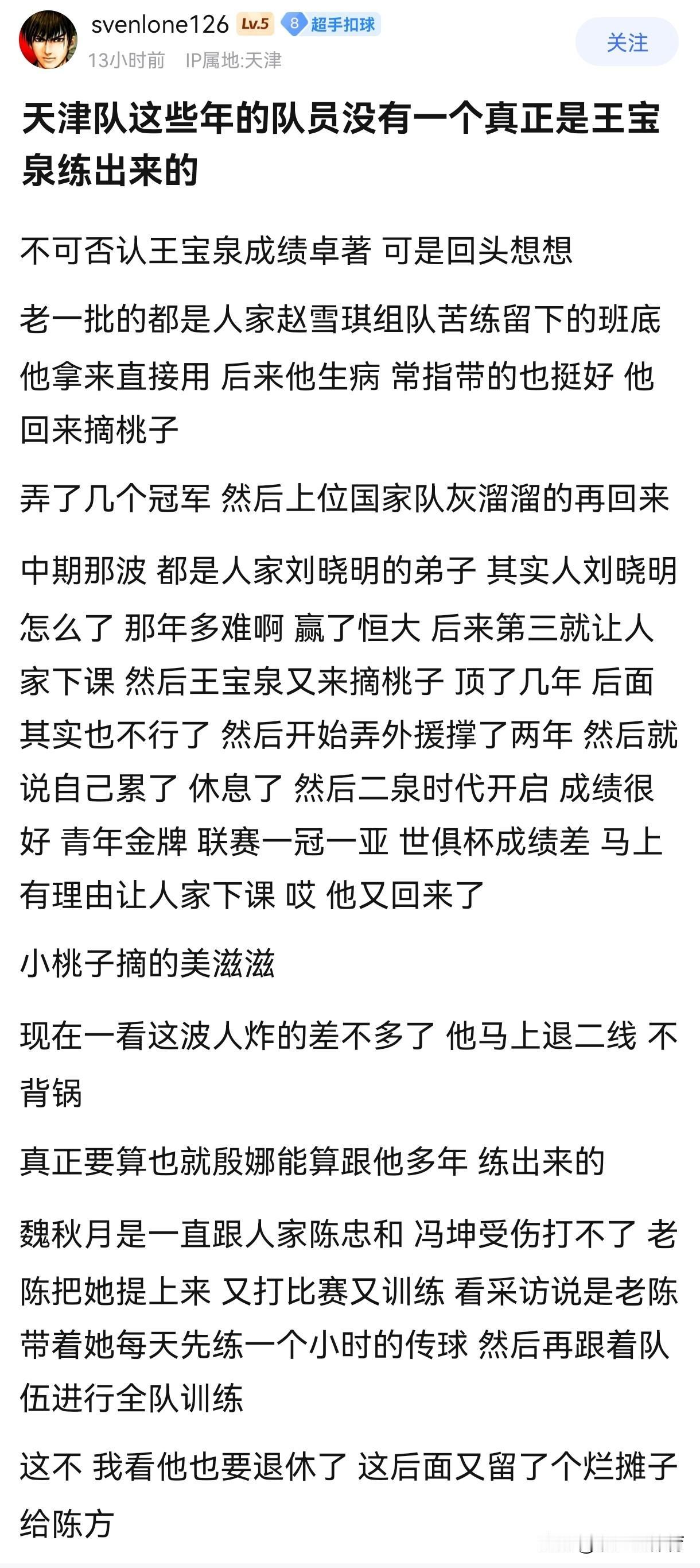 天津女排无缘全运会四强使得球迷将矛头对准王宝泉:他是“摘桃子”的。天津女排1-3不敌福建无缘全运会四强,好在今日上午争夺第5名资格的比赛中,先输一局的情况下,3-1逆转辽宁,取得争夺第5名的资格。不过天津女排输球也引发滔天舆论,球迷情绪难平,将矛头对准“教父”王宝泉。球迷认为当初成就王宝泉的那批队员是老教练赵雪琪的“遗产”,那批队员包括了如今的天津体育局副局长李珊、天津领队张静坤等人,她们的确是赵雪琪“三从一大”训练模式脱颖而出的佼佼者。而中间那批球员,应该是杨亚男、霍晶、陈丽怡等球员,天津球迷认为是刘晓明打造出的。还有如今以李盈莹、王媛媛、杨艺为首的这批球员,则是陈友泉亲手栽培出来的队员。不过刘晓明、陈友泉也都未能在天津女排主教练的位置上坐稳,时间并不久。“现在又留个烂摊子给陈方”,天津球迷愤愤不平。