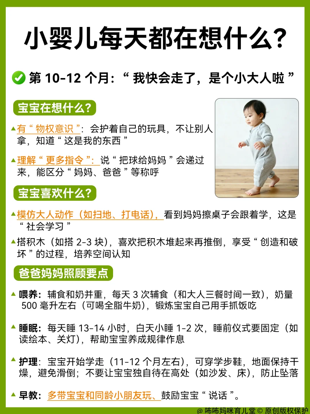 快一岁时,娃扶着沙发就能站,伸手要抱时我一扶就推开,非要自己挪步。他会用手指着奶瓶“要喝”,摇头表示“不吃”,还学我擦桌子的样子比划。这阶段他爱翻绘本(其实是撕)、听重复的儿歌,模仿大人说话。我给买了矮围栏和学步推车,让他放心练;他咿呀发声时,我就重复他的话回应,慢慢他就会说“妈妈”了!