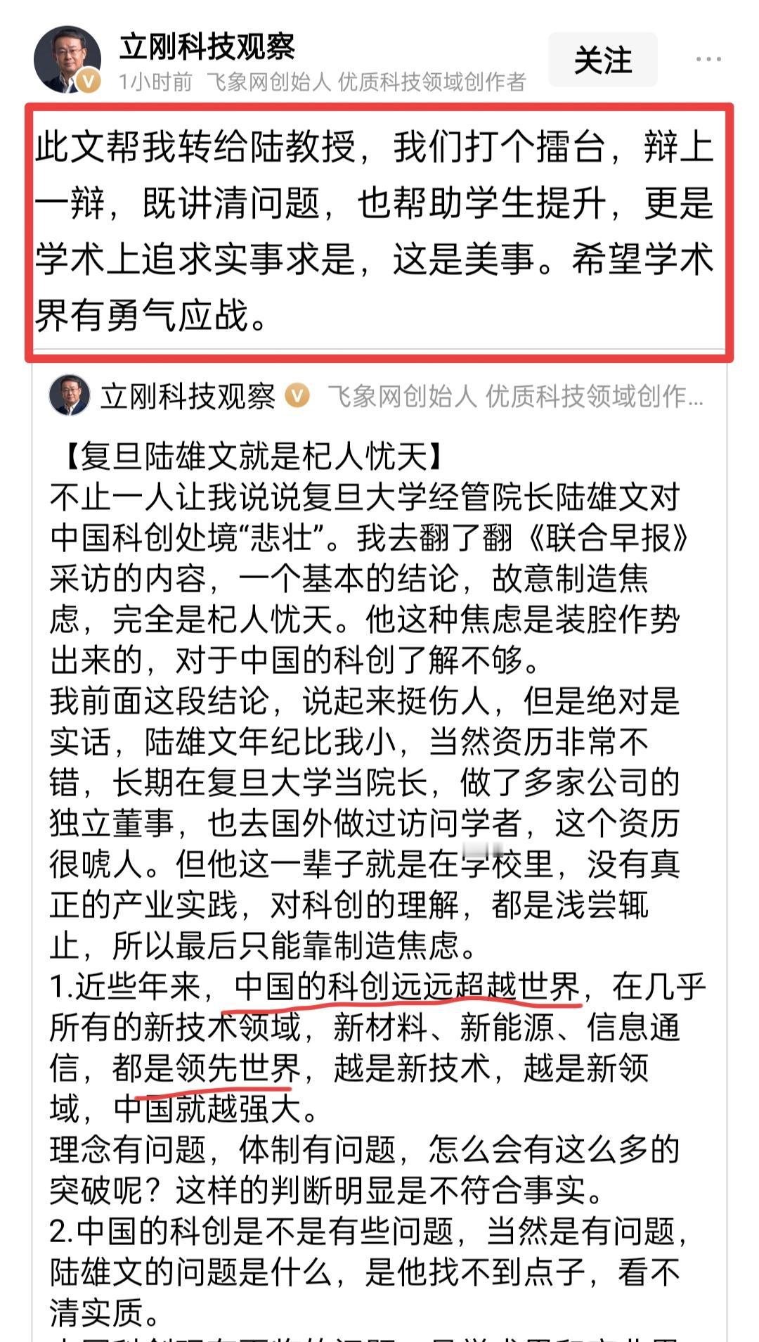 项立刚扬言要与复旦大学陆雄文先生打擂台,还喊话让网友把他的观点传达给陆先生。 首先咱们看看陆雄文先生说了什么样话,让项立刚这么激动呢? 陆先生近日说出了现在科研创新环境是什么样的,面临的是什么样的挑战? 项立刚说他说的不对,并认为这是在制造焦虑。 项立刚先生满心欢喜地认为,在科创方面,我们有很多东西已经是领先世界,超越世界了,并将陆先生批评了一番。 陆雄文先生大概率是不会回应的,与网红辩论是解决不了实际问题的。你说实际问题,他大唱赞歌,就根本不是一条路上的,交流也是浪费口舌的。 在科创方面,我们要相信会出一些了不得的成绩,要相信还有更多的年轻人在默默奋斗。还有很多像陆雄文先生这样的人在指导年轻人如何走科研正路,指导找到科创方面的短板,踏踏实实做科研,全面提升科创实力。