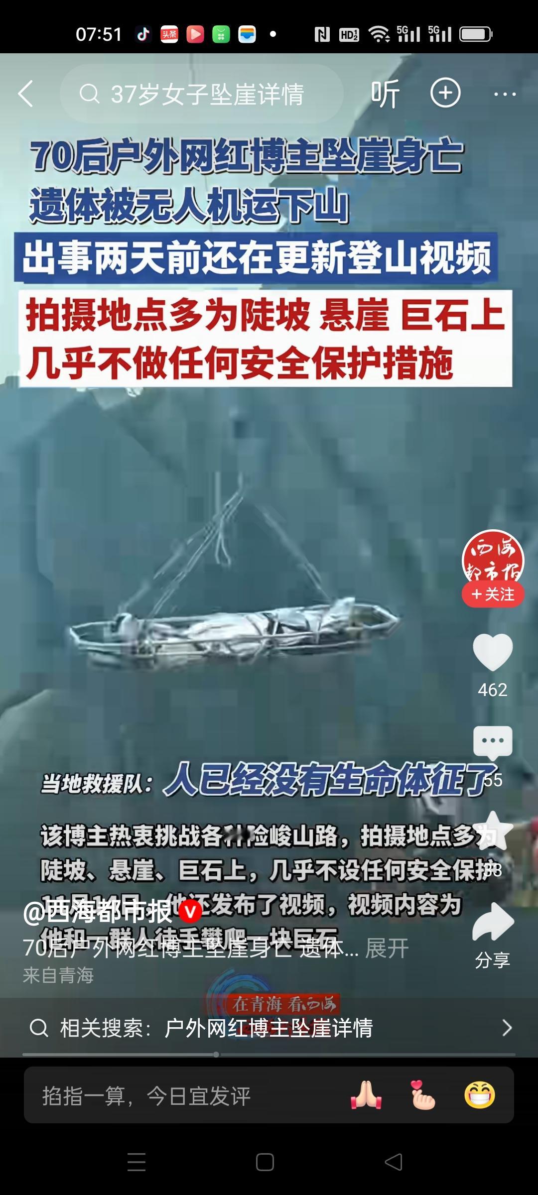 70后户外网红博主登山坠崖死亡,遗体被无人机吊运下山。