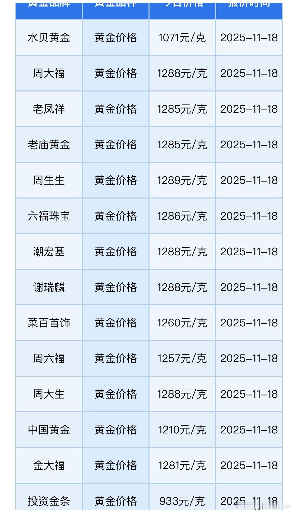 又跌了 黄金首饰价格又跌了 下半年需要结婚买首饰的,快看! 2025年11月18日,各品牌金店黄金零售价格下跌17元!今日黄金首饰价格每克在1099元到1289元区间(工费另计),投资金条价格每克933元。 周大福黄金首饰价格同比于昨天整整跌了17元/克。老庙黄金价格同比昨天下降了4元/克。周生生黄金价格同比下降了16元/克。 所有信息都只是提供参考价值! 购买黄金有风险,还是需要谨慎购买! 黄金售卖价格 黄金一克720 足金金饰价格 黄金金店价格 黄金价格680 金饰价 广东黄金价格