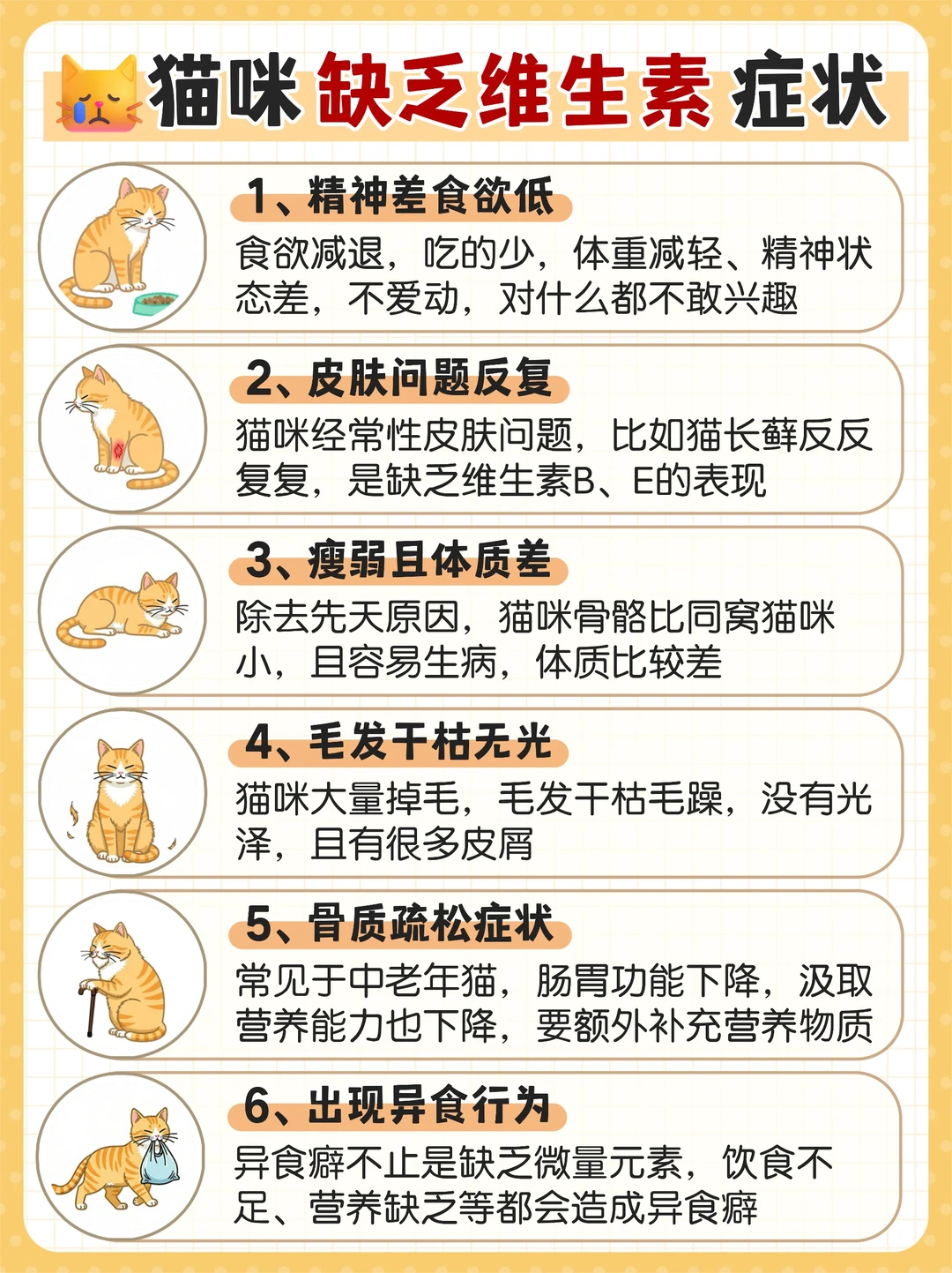 🐈猫咪缺乏维生素B族会带来一系列健康问题,因为B族维生素是水溶性的,无法在体内大量储存,需要依靠日常饮食持续补充。猫咪缺乏维生素会有以下表现,铲屎官一定要知道