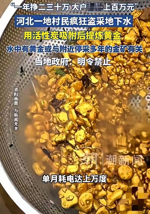 河北清河沿村的“淘金热”,真是把“贪心不足蛇吞象”演绎到了极致! 地下水抽出来炼黄金,看似一本万利,其实是在拿子孙的命换钱。 这些所谓的“黄金水”,其实是被废弃金矿残留的剧毒氰化物污染的地下水。 村民们用活性炭吸附黄金,再焚烧提炼,过程中重金属和毒素不断扩散。结果呢? 村里吃水井全枯了,河水被污染,孩子重金属超标,环境破坏触目惊心。 更讽刺的是,这种行为不仅违法,而且短视。罚款2.3万对年入百万的“大户”来说不过九牛一毛,根本起不到震慑作用。 我认为,要解决这个问题,不能只靠罚款和临时整治。 必须从源头切断违法链条,封死非法深井,建立长效监管机制,同时启动环境修复工程 。更重要的是,要让村民明白,绿水青山才是真正的金山银山。 你觉得,面对这种既破坏环境又危害健康的违法行为,应该如何从根本上杜绝?欢迎分享你的看法~