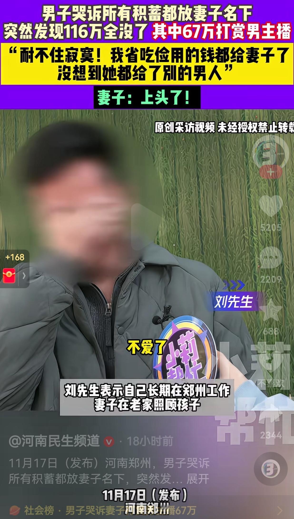 这就是真心喂狗了!河南郑州的刘先生辛辛苦苦奋斗了八年,一共存了116万元的定期存款,这笔钱全都交由妻子保管。 前一段时间,刘先生想看一看家里的存款还剩下多少钱? 谁知道就是这样一个简单的愿望,妻子一直支支吾吾,不愿意给丈夫看。 刘先生觉得事情没有这么简单,一定要看这笔存款。最后,在刘先生的再三追问下,男子这才发现自己这么多年辛辛苦苦挣来的钱,不仅一分钱都没有了,而且,还倒欠别人八万块钱。 刘先生查看妻子的消费记录,这不看不知道,一看震惊了!其中有67万元全部打赏男主播。继续追问其他的存款,妻子做了亏心事,一直也不愿意说。 刘先生为了追回存款,就找来了小莉帮忙栏目组。 刘先生当着小莉的面,也顾不上这么多了,直接就是掩面痛哭,男子说:“妻子在家照顾孩子,又不用上班,家里条件这么好,家里还有暖气。我在郑州租房住,房租才300块钱一个月,我舍不得吃,吃不得穿挣得钱全部都给妻子保管了。没想到的是,她却把67万元打赏给男主播了。我现在唯一的诉求,就是想挽回一点损失。” 后面,刘先生把小莉带回了家里,当面询问妻子,你是不是私下跟主播见面了? 面对询问,妻子一口咬定:“自己没有见面。” 刘先生继续询问:“既然没有见面,为什么刷这么多钱?” 妻子回答道:“我是他的粉丝,平时跟他聊天,在直播间给他拉票,自己上头了!” 目前,刘先生已经该问题反映给平台,等问题解决了,可能会提离婚的事情。 网友看到后评论说,她是成年人,做什么事情应该考虑后果,这笔钱想退回来,也不是那么容易了! 还有的网友说,这男人这么好,既能挣钱,又舍得给老婆花钱,你还耐不住寂寞,真的是有福都不会享受。 这一看就是男子平时工作太忙了,疏忽对妻子的关心,也疏忽对妻子的陪伴。妻子才想着,在虚拟世界里找一个精神寄托。 可是,就算丈夫对你缺少关心和陪伴,你也不能拿着丈夫的血汗钱肆意挥霍呀!夫妻过日子,不应该互相理解吗?你理解他赚钱养家的不易,他理解你带娃的艰辛,断不能因为寂寞,就胡作非为。这下好了吧?因为一时手快,弄得夫妻吵架,鸡犬不宁。甚至还有可能离婚,说来说去,都是咎由自取! 针对此事,大家作何感想?欢迎大家评论区讨论留言。