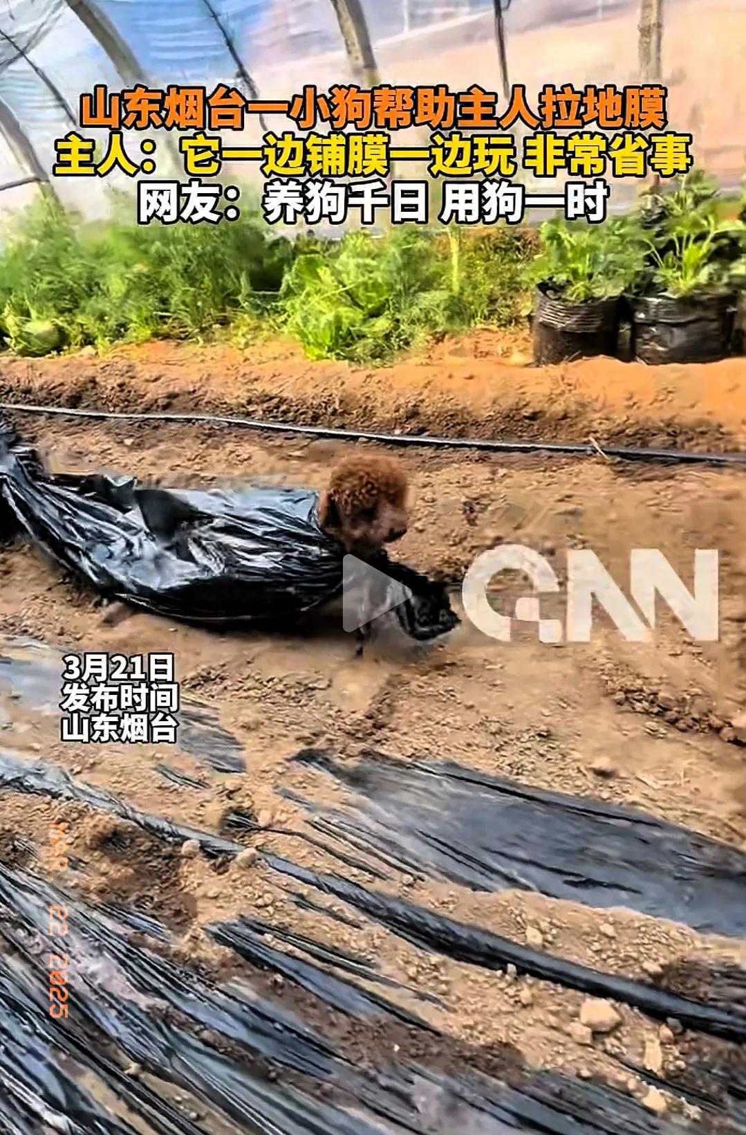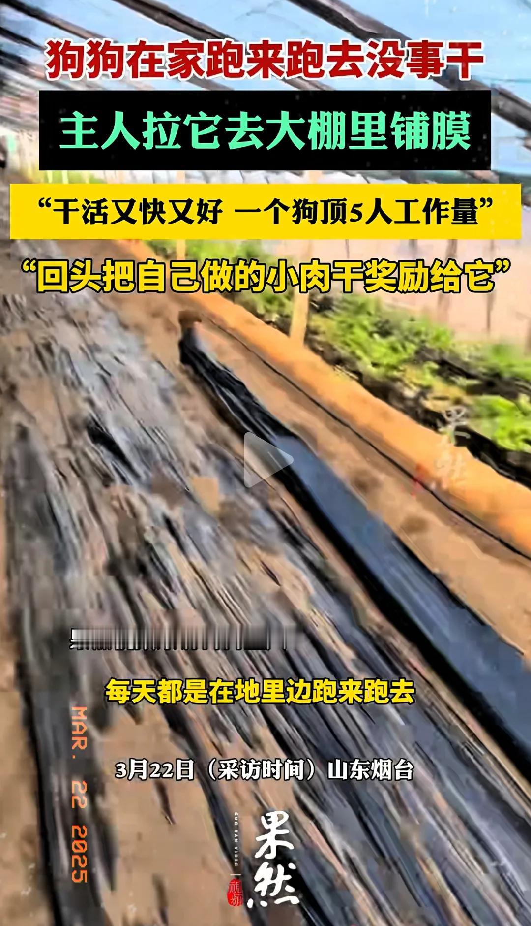 “太惊喜了!”3月21日报道山东烟台一男子在大棚里干活,家里的小狗总在地里跑来跑去,男子见小狗挺闲的,便把地膜套在小狗身上,没想到小狗竟帮他铺起了地膜,还跑的是直线![黑线] 一位种植户正在为西红柿苗铺设地膜,这时,他收养的小狗“丢丢”摇着尾巴凑了过来,主人一时兴起,把地膜的一端轻轻套在小狗身上。 没想到“丢丢”立刻领会了主人的意图,它沿着田垄小跑起来,身后拉出的地膜笔直平整,完全不需要人工调整,原本需要反复弯腰整理的工作,因为小狗的参与变得轻松许多。 这只聪明的小狗是主人去年从路边捡回来的流浪狗,平时主人下地干活时,它总喜欢在田里跟着跑来跑去,对大棚环境非常熟悉,正是这种日常的陪伴,让它能准确理解主人的需求。 长期与人类共同生活让它们更善于观察人的行为,不过像“丢丢”这样能准确完成农业劳作的情况确实比较特殊,这与它经常跟随主人出入大棚有直接关系。 有的家庭犬能帮主人递送工具,但这种未经专门训练,自然形成的协作关系,往往源于日常生活中建立的深厚信任。 主人为感谢“丢丢”的帮助,特意准备了自制的肉干作为奖励,这个温暖的瞬间被记录下来,展现了人与动物之间独特的情感纽带。 万物皆有灵,小动物是人类最真诚的朋友。 “丢丢”的小狗帮忙铺地膜的趣事,真是让人忍俊不禁,也勾起了很多网友分享的欲望,讲述自家宠物的“光荣事迹”。 “这狗子太灵了,我家以前养的大黄狗也会看摊儿,要是有人靠近我家三轮车,它就跑过去蹲在旁边,比锁都管用。” “这狗是编制内的吧,干活这么卖力,我家二哈要是有这一半懂事,我也不用天天跟着它后面收拾‘拆家’现场了。” “‘关键不是狗聪明,是主人会引导,’看得出来主人平时对狗很好,狗才愿意跟着学,动物都有模仿能力,你给它正向反馈,它就更来劲。” “这才是真正的智能农机,不烧油不充电,干完活奖励点肉干就行,环保又经济。” “我家猫会帮我拿小东西,比如发圈,虽然十次里有八次是叼到床底下找不到,但这份心咱得领。” 你认为宠物这种看似“帮忙”的行为,究竟是它们真的理解了我们的意图,还是一种聪明的巧合呢? 信源:封面新闻