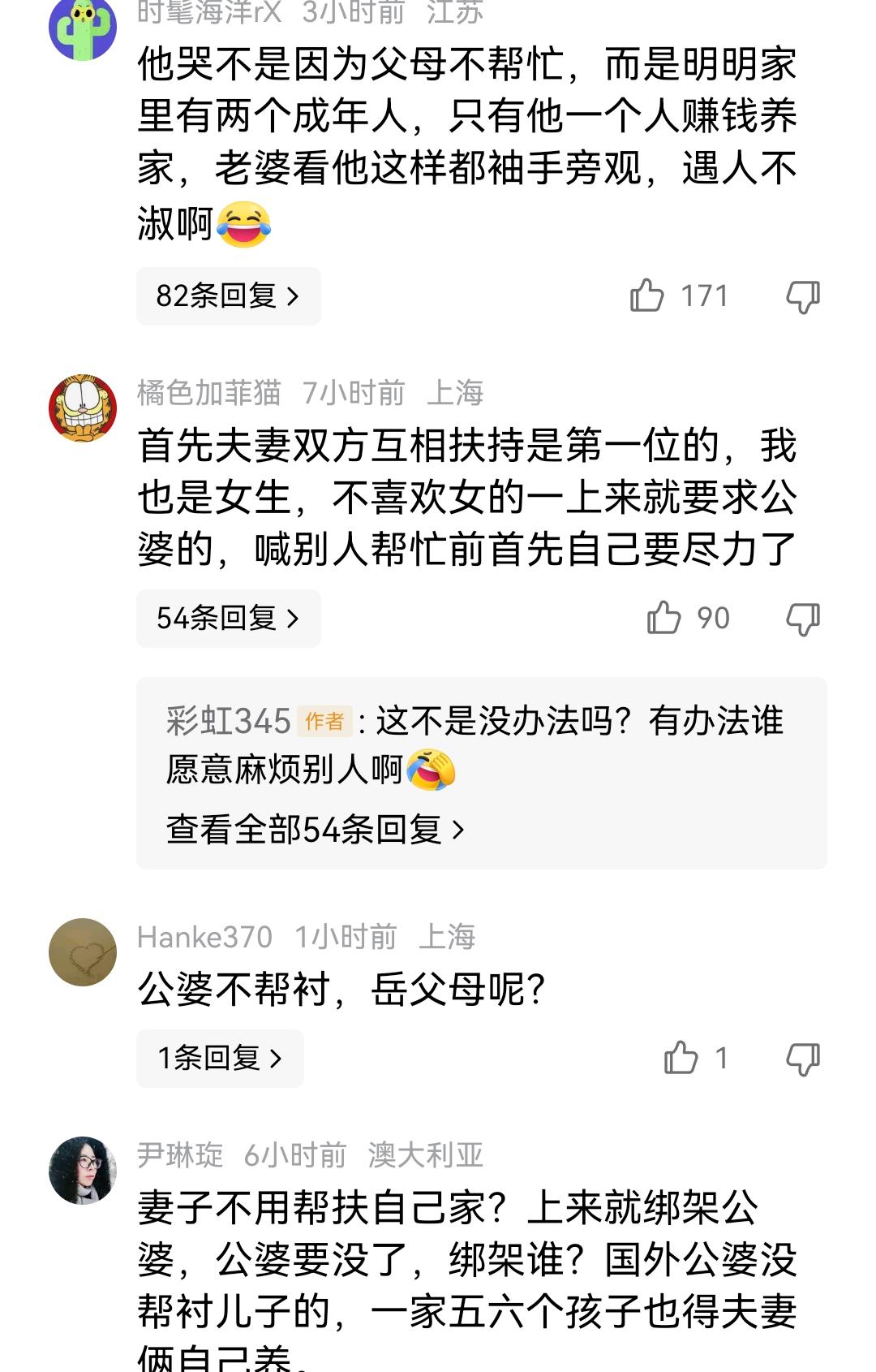 男子崩溃大哭,妻子说他养一家三口太累,而公婆根本不帮衬,看着是为难儿媳,实际上是为难儿子。可网友们不买账,纷纷反击。 一个男子在公共场合崩溃大哭,哭啥呢?因为他压力大,一个人要养一家三口,自己爸妈还不出钱,一点不帮衬。 这句话是妻子说的,她把锅甩给了公婆。 而广大网友不认可,他们说丈夫的崩溃在于,明明家里两个成年人,却只有他一个人赚钱养家。 妻子在干嘛?她为什么不一起工作。为啥把责任都甩给公婆? 还有人说,既然妻子指责公婆不帮衬,是为难儿媳妇,那么岳父母呢?为啥不帮女儿,这是故意为难女婿吗? 家家有本难念的经,真的不好说,我只能说,成年人真的不容易啊。 公婆的难处