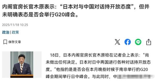 日本出来回应了!在我们明确宣布G20峰会期间没有与高市早苗的会晤安排之后,日本出来回应了!11月18日,日本内阁官房长官木原稔在记者会上表示:尚未做出任何决定。并称,日本对日中两国进行各种对话持开放态度。他还透露,将于18日在北京举行的日中局长级磋商是双方定期举行的磋商。上次是在日本举行,所以这次将在北京举行。   木原稔这话听着模棱两可,其实藏着不少心思。要知道我们为啥不安排和高市早苗的会晤,得先看看这位日本首相最近干了啥。   就在11月初的国会答辩上,高市早苗公然说“台湾有事”可能算日本的“存亡危机事态”,暗示真出事了日本说不定要动武。这话可不是随口一说,简直是在往中日关系的火上浇油。   我们外交部当即就召见了日本驻华大使,把态度摆得明明白白。这种情况下,怎么可能安排高层会晤?日本政府心里门儿清,所以木原稔才急着出来放话,说对各种对话都开放。他们怕我们真把高层沟通的大门关上,那损失可就大了。   日本现在的处境挺拧巴的,高市早苗想跟着美国的调子走,拿台湾问题刷存在感,巩固自己的保守派基本盘。可她忘了,日本的经济命脉早跟我们绑在了一起。数据摆着呢,日本对华贸易额占了他们外贸总额的23%,汽车、电子这些支柱产业,少了中国市场立马就得停摆。   就说汽车行业,日本车企在华卖的车占了他们海外销量的一大半。要是中日关系闹僵,这些车企的生产线都得受影响。日本商界早就急得跳脚,不少大企业老板私下里都在给政府吹风,千万别跟中国把关系搞砸。   所以木原稔才特意提一嘴北京的局长级磋商,说这是“定期安排”。他就是想对外放信号,中日官方沟通没断,日本没在对华关系上服软。可这话说穿了就是给自己找台阶,真要是不在乎,犯不着特意在记者会上强调这是“定期机制”。   更有意思的是,高市早苗的那套激进言论,在日本国内也没得到多少支持。前首相鸠山由纪夫直接在社交平台上怼她,说台湾问题是中国内政,日本绝不能插手。另一位前首相石破茂也批评她,说她这话跟“台湾有事就是日本有事”没区别,太轻率了。   日本的学者们看得更明白,名古屋外国语大学的川村范行教授就说,高市早苗这是在向中国“预告战争”,纯属不负责任。战后八十年中日没再打仗,真要是因为她一句话把局面搞崩,日本老百姓第一个不答应。   他们现在搞的这套“既要又要”,根本行不通。想靠打台湾牌讨好美国,就得承受我们的反制;想保住对华经济利益,就得收敛那些干涉中国内政的小动作。木原稔的回应,本质上就是这种矛盾心态的直接体现。   再说了,我们对日本的态度一直很明确。去年年底开始,我们就对日本普通护照实行免签政策,就是想推动两国多交流。可交流的前提是相互尊重,不是一方拿着原则问题当筹码。   日本要是真有诚意推进高层会晤,光靠木原稔在记者会上说漂亮话没用。高市早苗得先把那些涉台错误言论收回去,真正遵守中日联合声明里的承诺。不然的话,就算搞再多“定期磋商”,高层会晤的大门也不会敞开。   现在的日本就像走钢丝,一边是想跟着美国的政治节奏,一边是离不开中国的经济支撑。木原稔的回应,不过是他们在钢丝上保持平衡的无奈之举。能不能走好这条路,关键还看日本政府接下来怎么选,是顾着政治投机,还是保住老百姓的切实利益。
