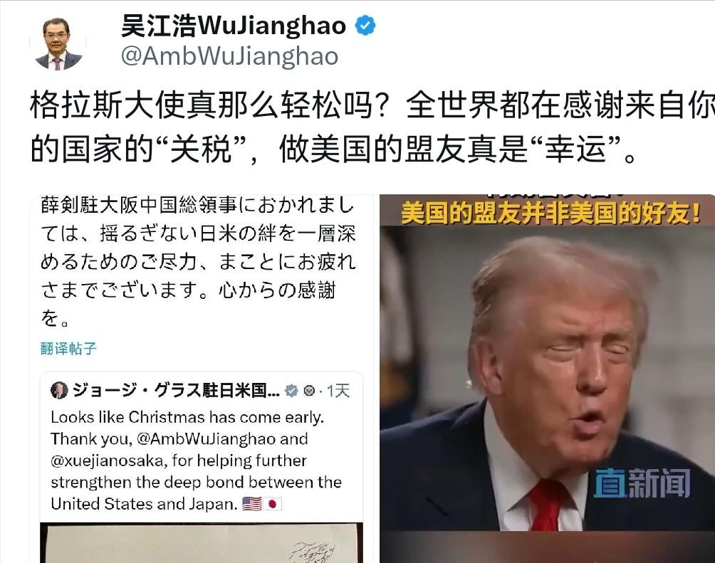 完全不惯着!美国驻日大使被怼的哑口无言!在美国驻日大使格拉斯表示,“感觉就像圣诞节提前到来了。我谨向中国驻日本大使吴江浩和中国驻大阪总领事薛健致以诚挚的谢意,感谢他们为进一步深化日美之间牢不可破的友谊所付出的辛勤努力”之后,我们的驻日大使吴江浩出来回应了。 11月17日,吴江浩大使表示,格拉斯大使真那么轻松吗?全世界都在感谢来自你的国家的“关税”,做美国的盟友真是“幸运”。很显然,对于我们连续反击高市早苗的恶劣言论,美国大使完全是一副兴高采烈的嘴脸,认为中国推进了美日关系更加紧密,就如同圣诞节提前来到一样。 结果没想到我们大使非常直白的揭了美国的老底子。我们大使的意思很清楚,美国不是鼓吹美日关系很好吗?那美国为什么要对日本加税,对日本捅刀子。 这番外交辞令的交锋,可比任何戏剧都来得精彩。美国驻日大使伊曼纽尔,也就是我们提到的格拉斯,他那段“圣诞节提前到来”的感谢,听起来就像是隔岸观火后幸灾乐祸的调侃。 他眼看着中国因为日本政客高市早苗等人触碰红线而采取反制措施,日本政府因此显得有些被动,他便觉得这是美国巩固同盟、拉拢日本的绝佳机会。 这种心态,说白了就是把盟友当棋子,看到棋子被对方“将军”了,自己非但不帮忙,反而拍手叫好,觉得这盘棋自己赢定了。这种高高在上的姿态,仿佛在说:“看,被我言中了吧?还是得靠我美国。” 然而,他显然算错了一步,那就是低估了如今中国外交的风格。我们不再仅仅是严正交涉,不再仅仅是表达抗议,而是开始用对方听得懂,甚至让对方感到刺痛的方式来回应。 吴江浩大使的回击,正是这种风格转变的绝佳体现。他没有掉进伊曼纽尔设下的“中国破坏地区稳定”的话语陷阱,而是直接掀了桌子,把问题引向了美日关系的内部矛盾。一句“全世界都在感谢来自你的国家的‘关税’”,瞬间就让伊曼纽尔的“圣诞节”显得无比讽刺。 这可不是空口说白话。美国这些年对日本干的“好事”可不少。当年特朗普政府挥舞关税大棒,对日本的钢铁和铝制品狠狠加税,理由是“威胁美国国家安全”。 这把刀子直接捅在了日本经济的要害上。后来的拜登政府,嘴上说着要修复盟友关系,可这关税迟迟不肯完全取消。 更有意思的是,拜登推出的《通胀削减法案》,看似是美国国内的产业政策,实际上却把日本、欧洲这些盟友的电动汽车产业排除在补贴范围之外,明摆着是要用市场壁垒来扶持自家企业。日本车企在美国市场打拼多年,最后却落得个“非嫡出”的待遇,这心里的苦,又能向谁诉说? 吴江浩大使把这笔账翻出来,意思再明白不过了:你美国一边唱着“牢不可破的友谊”的高调,一边却在经济上实实在在地割盟友的肉。 中国只是对日本个别政客的错误言论进行点名批评,你就高兴得像过节,那你美国对日本整个国家下黑手的时候,日本是不是该给你过个春节? 这种对比,让伊曼纽尔那句轻飘飘的感谢,瞬间变得苍白无力。他原本想站在道德高地上指手画脚,结果被一记勾拳打中了经济现实的软肋,哑口无言也就不奇怪了。 这场交锋的背后,其实是国际格局变化的一个缩影。过去,很多国家在面对美国的双重标准时,往往选择隐忍或旁敲侧击。但现在,越来越多的声音开始直接挑战这种不平等的关系。 中国驻日大使的这次回应,不仅仅是为高市早苗事件本身,更是向外界传递一个信号:那种美国说啥就是啥,盟友只能默默承受的时代,正在发生变化。我们开始把桌子上的潜规则,直接摆到台面上来聊,用事实和逻辑来解构那些虚伪的口号。 这场外交风波也让日本处在一个颇为微妙的境地。一边是必须依靠的安全保障,一边是实实在在的经济利益和最大的贸易伙伴。 当自己的两个“重要伙伴”当着自己的面如此直接地“开撕”,不知道日本心里是何滋味。是感到尴尬,还是在盘算如何在这场大国博弈中为自己争取更多空间? 这恐怕是一个比伊曼纽尔的“圣诞节”更值得深思的问题。当“盟友”的真相被如此赤裸裸地揭开,未来的国际关系,又会走向何方呢?这或许才是我们每个人都应该思考的。