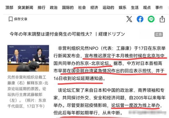 日本麻烦大了!东京-北京论坛被暂停!11月17日,根据日媒报道,日媒称,原定于本月晚些时候在北京与中国共同举办的东京-北京论坛被暂停。日本方面称,中方对日本首相高市早苗在国会就台湾紧急情况作出的回应表示担忧,并于16日发出论坛延期通知函。   很显然,该论坛被暂停,日本方面明显感到不同寻常。为什么这么说呢?事实上,该论坛汇聚了来自日本和中国的政治家、商界领袖和专家,共同探讨外交、安全和经济问题,自2005年以来每年举办,在疫情期间都不曾中断,而现在被暂停,这说明什么呢?这说明高市早苗的言论对于中日两国正常的交往产生了实质性影响。   要知道这个论坛可不是随便的茶话会,它是目前中日间规模最大、层次最高的公共外交平台之一,二十年来每次开会都能聚起两国四百多位各界代表。小到民间文化交流,大到数字经济合作,甚至是核安全、老龄化这些棘手问题,都能在这儿找到对话的机会。疫情最严重的时候,线下没法聚就转线上,硬是没断过档,足见它在两国关系里的分量。   要知道中日建交时就把台湾问题说死了,四个政治文件里写得明明白白。1972年的《中日联合声明》里,日方明确承认中华人民共和国政府是中国唯一合法政府,也充分理解和尊重台湾是中国领土的一部分。之后的和平友好条约、联合宣言,每次都在重申这个立场。   这些规定都有国际法效力,容不得半点含糊和曲解。高市早苗作为日本首相,在国会这种正式场合发表涉台言论,往轻了说是没把握好分寸,往重了说就是触碰了中日关系的政治红线。中方外交部发言人毛宁17号就明确表态,这种言论严重违背中日四个政治文件精神,从根本上损害了两国关系的基础。   更让日方坐不住的是,被暂停的不只是论坛。紧接着就有消息说,原本要发布的中日联合舆论调查也跟着延期了。毛宁把话挑得很明白,高市早苗的挑衅言论恶化了两国的民意氛围,现在发布调查结果的条件已经变了,这个责任得日方全担着。   日本商界这会儿估计已经急得转圈了,这些年中日经贸合作一直是两国关系的压舱石,2024年两国贸易额就近3500亿美元。论坛上那些商界领袖本来盼着能谈成几个合作项目,现在平台停了,不少正在推进的合作也跟着悬了。要知道,日本的汽车、电子零部件企业,对中国市场的依赖度一直不低,这种官方交流渠道一断,民间合作的信心都得受影响。   面对中方的反应,日本政府还在嘴硬。内阁官房长官木原稔出来辩解,说日本在台湾问题上的立场没改,和1972年的联合声明一致。这话听着就没底气,立场不是靠嘴说的,得看实际行动。高市早苗的言论已经摆到台面上,中方的担忧也明明白白提了出来,光靠辩解根本解决不了问题。   二十年来,这个论坛多少次在中日关系的关键节点上发挥作用。钓鱼岛问题紧张时,双方在论坛上呼吁和平解决;疫情期间,这里又成了分享防控经验的平台。它能持续运作,核心就在于双方都守住了政治底线。现在日方先破了规矩,暂停论坛就是中方明确的态度。   日本现在的麻烦,本质上是自己找的。想在台湾问题上打擦边球,又不想承担后果,哪有这么好的事。中方已经把话说明白了,敦促日方停止越线玩火,收回错误言行。接下来就看日方怎么选了。是赶紧纠正错误,让论坛和两国交流回归正轨,还是继续硬扛,让麻烦越积越多。   对日本来说,现在可不是纠结面子的时候。中日是一衣带水的邻邦,合则两利,斗则俱伤。这个暂停的论坛,既是警告,也是机会。要是真把中方的底线当摆设,以后麻烦只会比现在大得多。