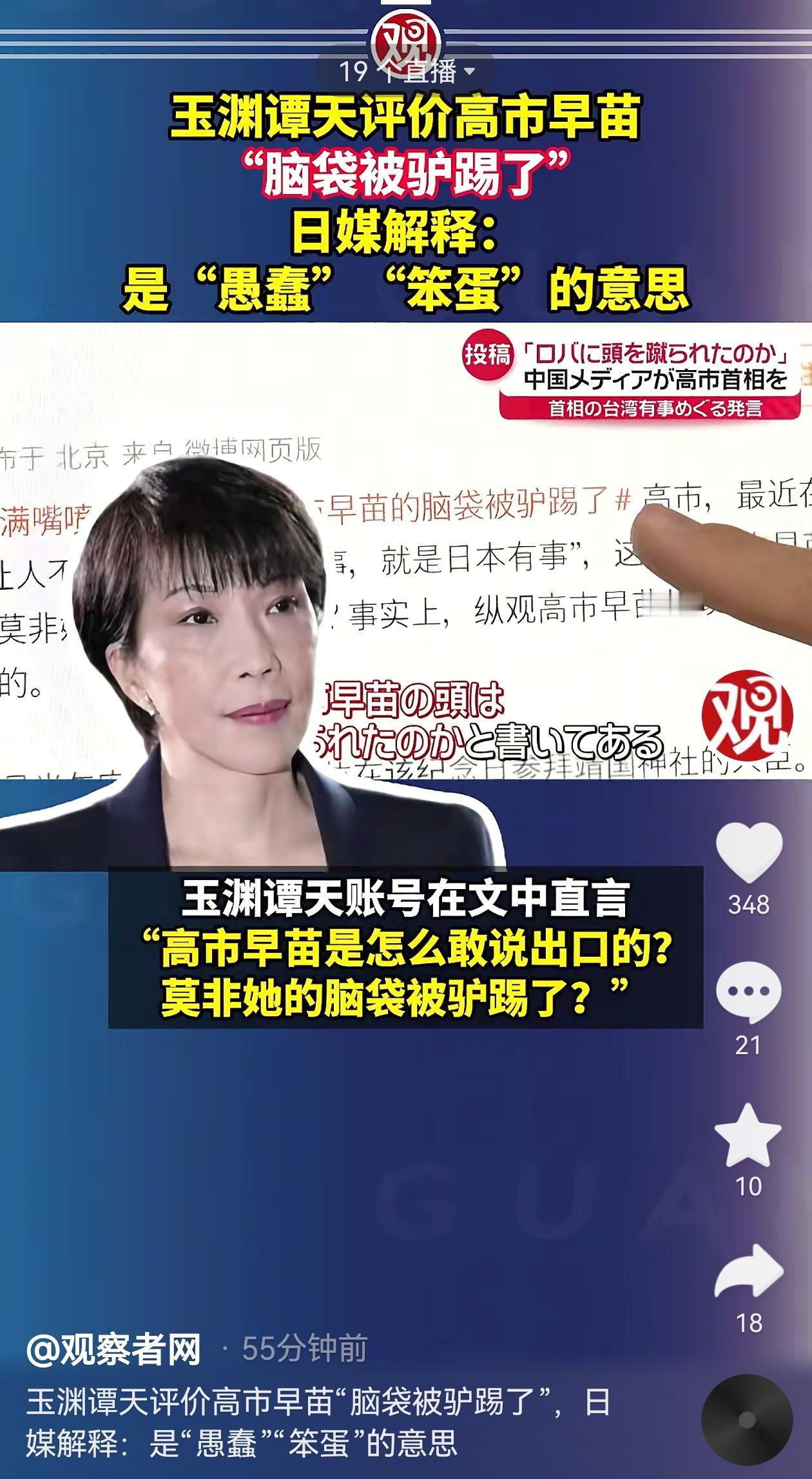 NTV新闻解释脑袋被驴踢了,只是笨蛋的意思吗?日本没有人工智能吗,听听KIMI的解释:“脑袋被驴踢了”是一句中文里的民间俚语,常用来形容某人做出了违背常理、非常愚蠢或不可理喻的行为。这句话带有明显的调侃和贬义色彩,暗示对方的思维或判断力出了问题,就像脑袋被驴踢过一样“坏掉了”!我以为这句话的精髓就是驴!高市早苗就是那头黔驴技穷的驴,叫两声之后,就被老虎吃了。另外,高苗长得也真像驴!