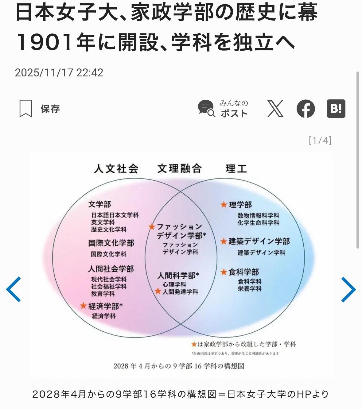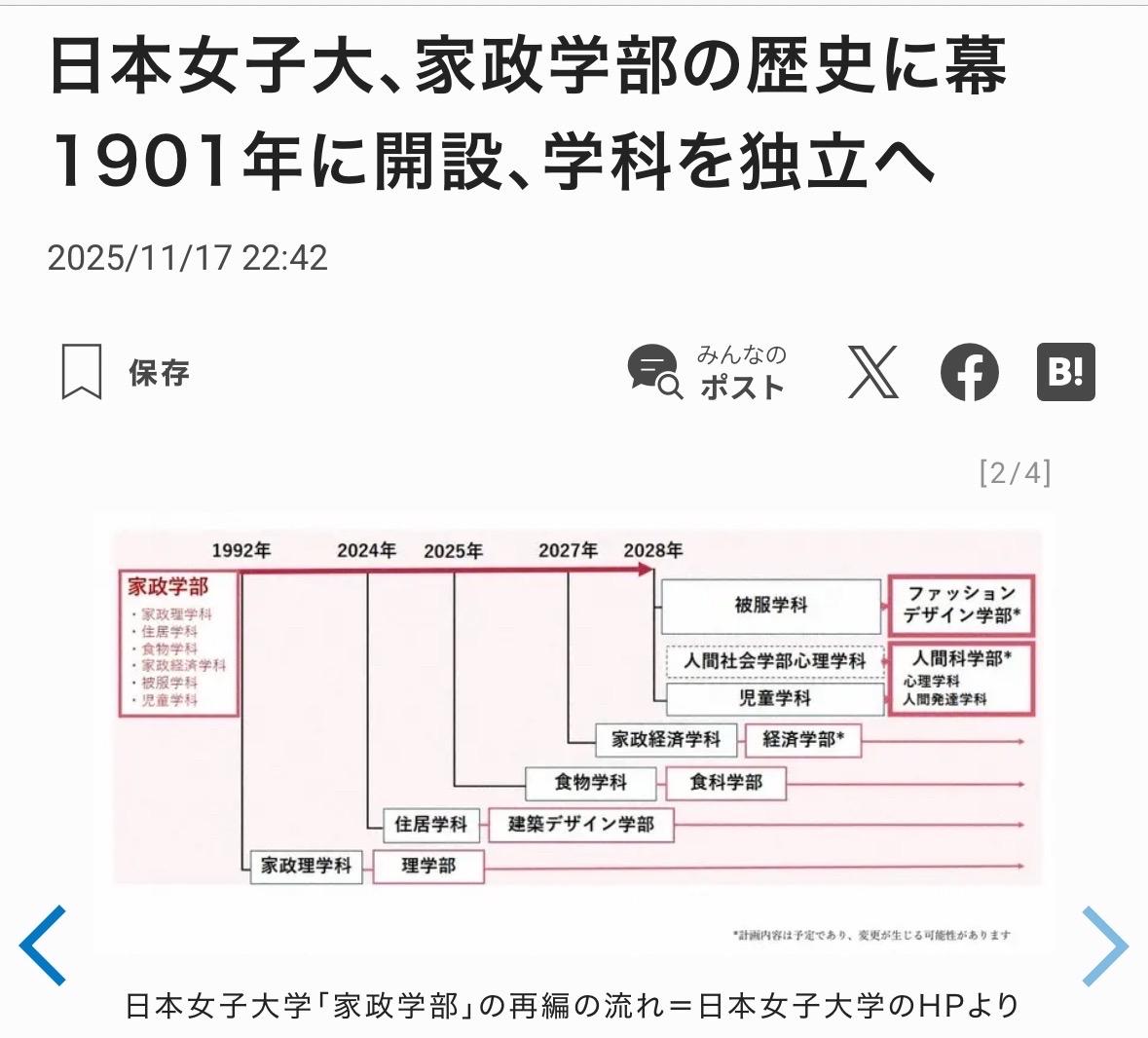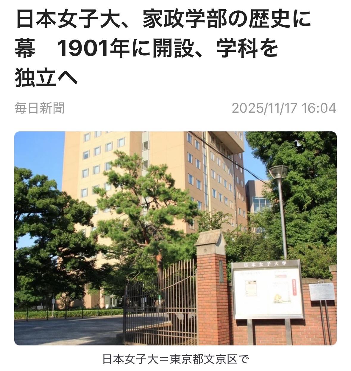 日本女子大学(东京都文京区)11月17日宣布1901年建校以来持续的家政学部学科到2028年全部学部化的构想。经历1世纪以上风风雨雨,提供追求生活品质向上的学习场所的日本女子大学看板学部的名称将消失。 家政学部是日本女子大学校建校同时开设的,至今培养了约4万毕业生。但随着时代变化,“家政学”样子也在变化。变成“磨练家事技能”,各学科夜作为学部独立,希望以此让特征更明确。 根据日本女子大学,现在在校学生的家政学部学科分儿童、食物、居住、被服、家政经济五部分。首先居住学科2024年成为建筑设计学部、食物学科2025年独立成食科学部。 还在招收学生的3学科里,家政经济学科2027年改经济学部、儿童学科2028年改组为人间科学部。只有被服学科留下来,2028年变成时尚设计学部。