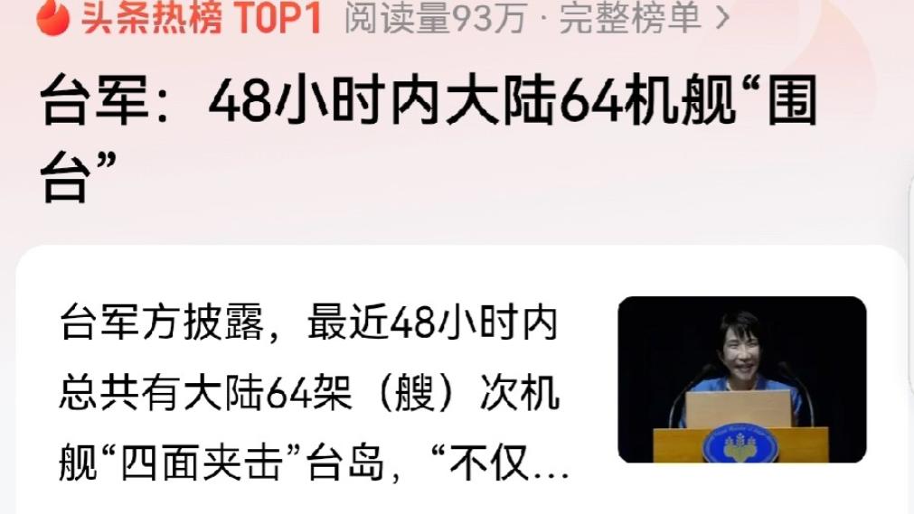 这次皮球踢到了日本脚下! 台军方披露,在最近48小时内总共有大陆方面64架次的军机和舰艇,在台湾的周边形成夹击之势。这正好对应了日本方面所称的“台湾有事”,那接下来就看一看日方的行动了。 那些做出危险行径的人最后,必定得承受自身行为导致的不良后果,肯定会以血本无归告终,高市早苗企图,靠核武装还有台海挑衅来获取政治资本,却错估了形式。 是时候揍小日本了,只要把小日本揍怕了,台湾问题也就没有问题了,东亚东南亚这边最起码能安静50年,菲律宾越南韩国这些喜欢跳的国家就再也不敢蹦哒了! 不首先使用核武器是对的,几十年前人家已使了,我们现在什么时候使用也不是首先的。现在就问小日本,你敢来吗?你来就把你击沉,你还做着当年甲午战争梦呢?