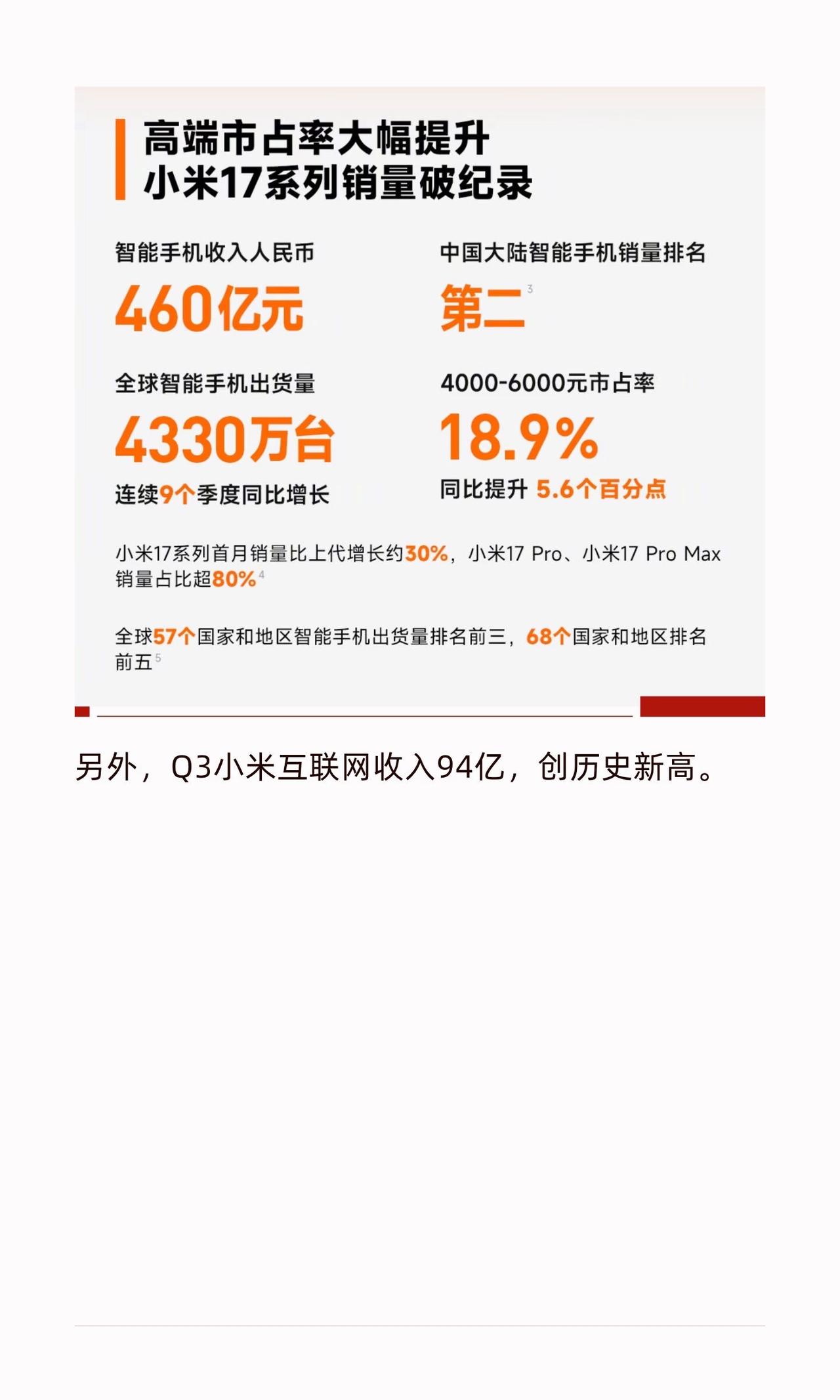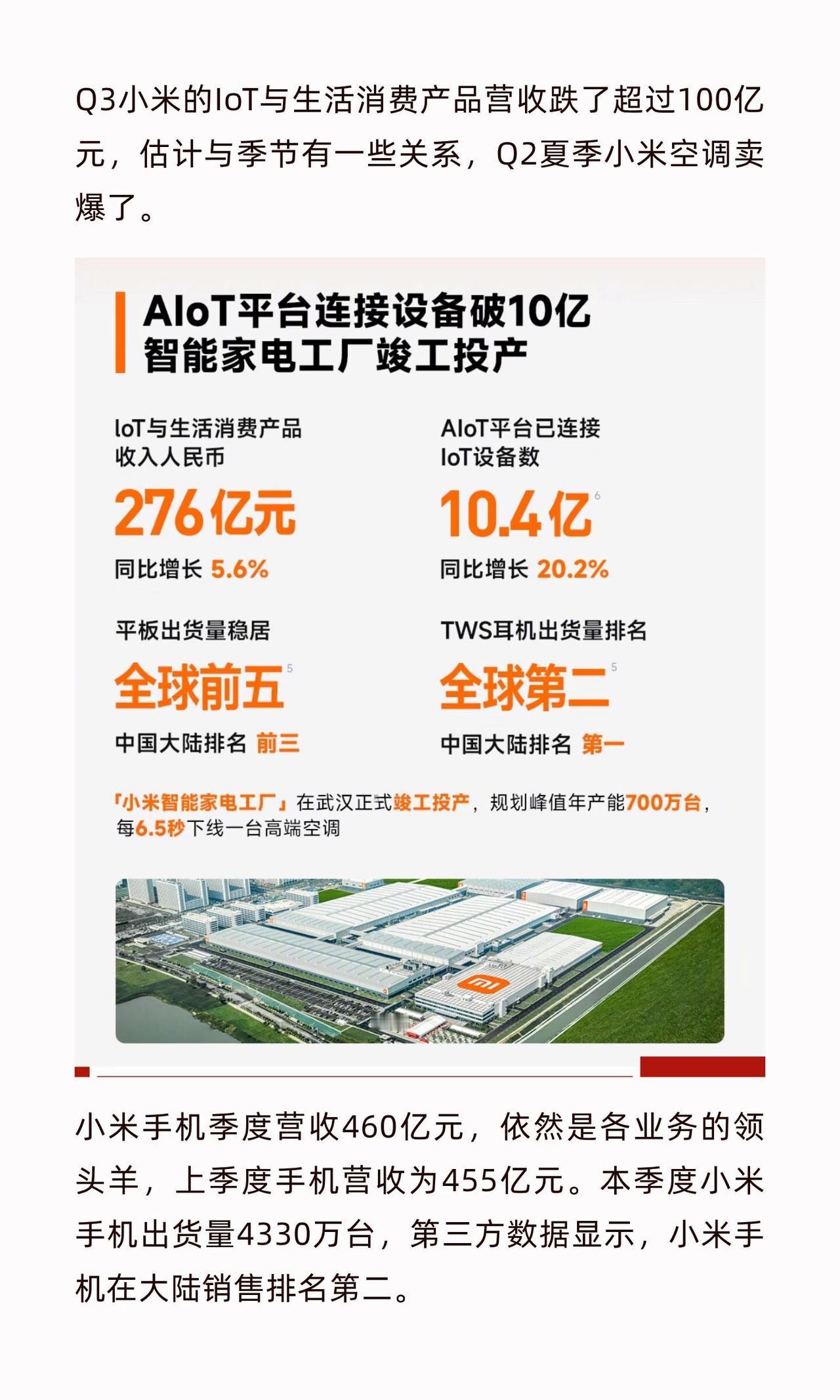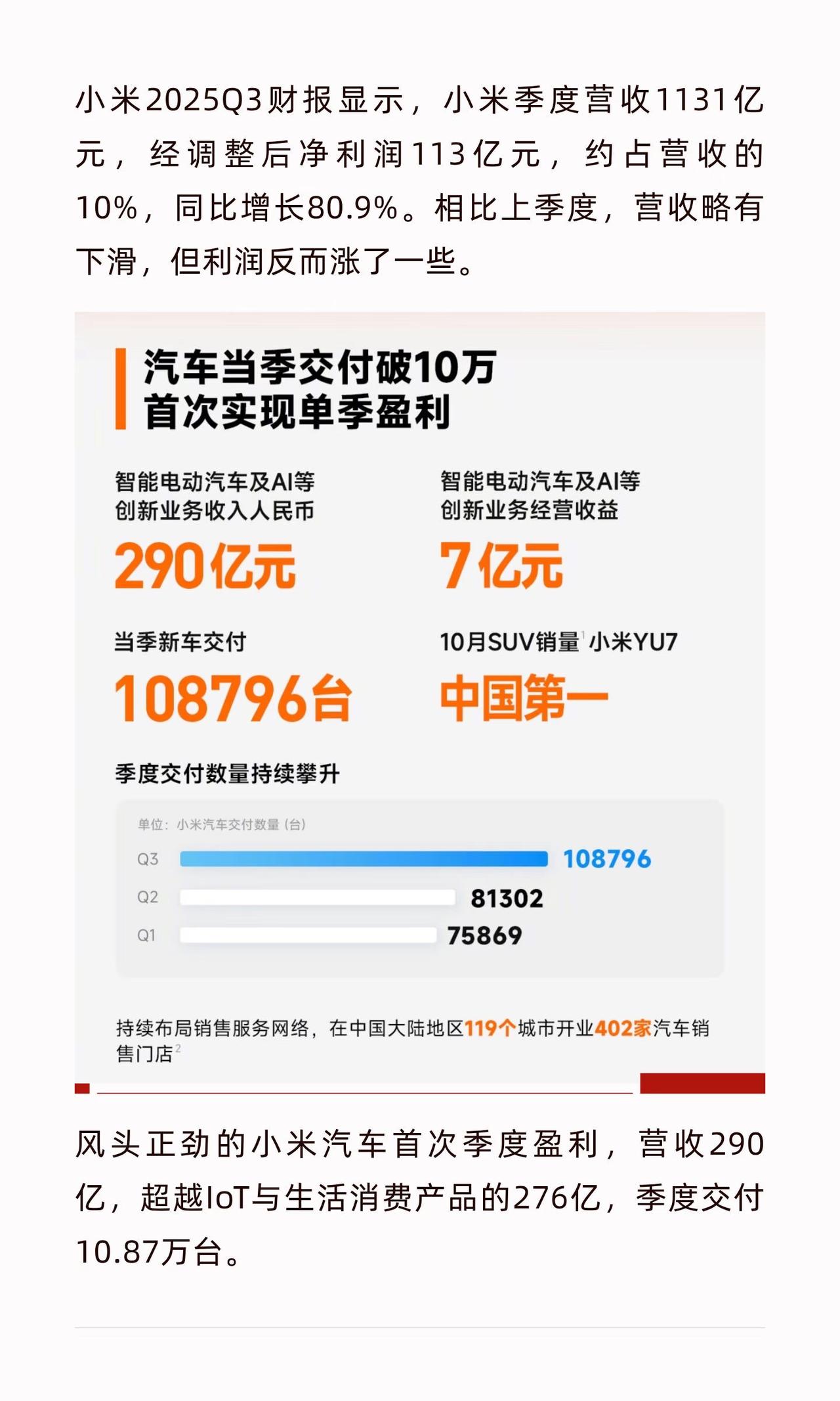 小米集团又交出了一份亮眼的季度财报,净利润新高,约为营收的10%。 小米2025Q3财报显示,小米季度营收1131亿元,经调整后净利润113亿元,约占营收的10%,同比增长80.9%。相比上季度,营收略有下滑,但利润反而涨了一些。 风头正劲的小米汽车首次季度盈利,营收290亿,超越IoT与生活消费产品的276亿,季度交付10.87万台。 Q3小米的IoT与生活消费产品营收跌了超过100亿元,估计与季节有一些关系,Q2夏季小米空调卖爆了。 小米手机季度营收460亿元,依然是各业务的领头羊,上季度手机营收为455亿元。本季度小米手机出货量4330万台,第三方数据显示,小米手机在大陆销售排名第二。 Q3小米互联网收入94亿,创历史新高。
