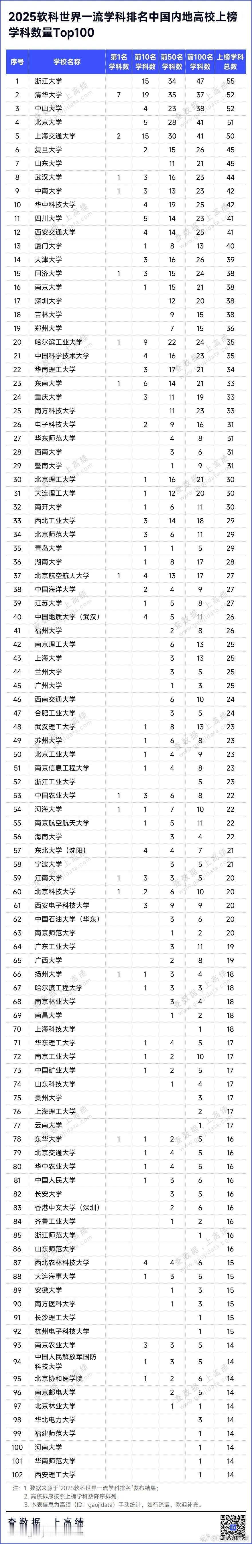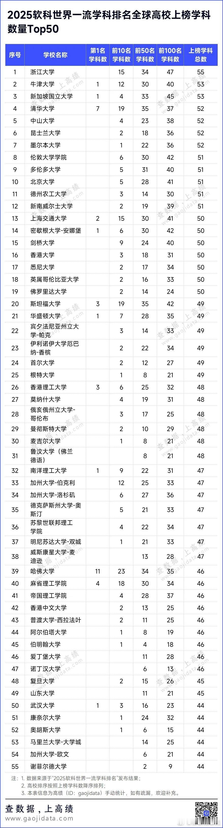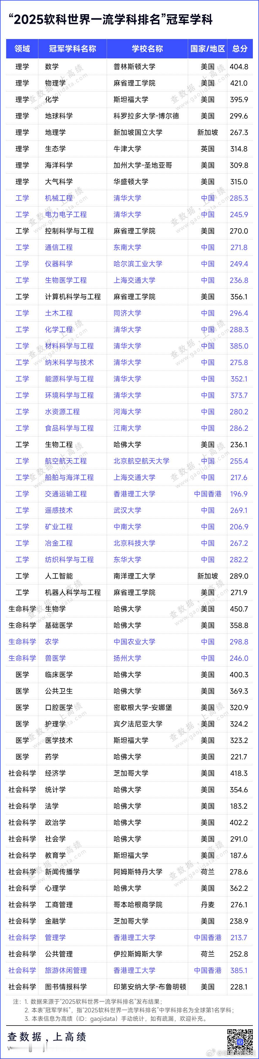 2025软科世界一流学科排名发布!今天(11月18日),高等教育评价专业机构软科正式发布2025“软科世界一流学科排名”(简称GRAS)。美国大学在今年的软科世界一流学科排名中仍然保持领先,在27个学科占据榜首,上榜总次数达到4281次,位列全球第一。中国内地高校持续进步,在21个学科拔得头筹,上榜总次数3747次,位列全球第二,上榜高校数量达到359所。