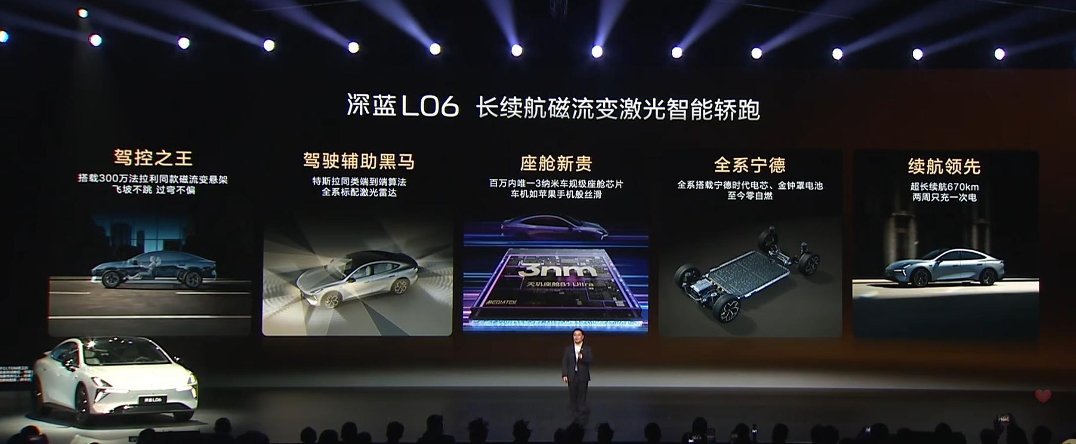 深蓝 L06 搭载 300 万法拉利同款磁流变悬架,特斯拉同类端到端算法,百万内唯一 3 纳米车规级座舱芯片,全系宁德时代电芯,续航 679km,不得不说,现在国产车有够卷的。
