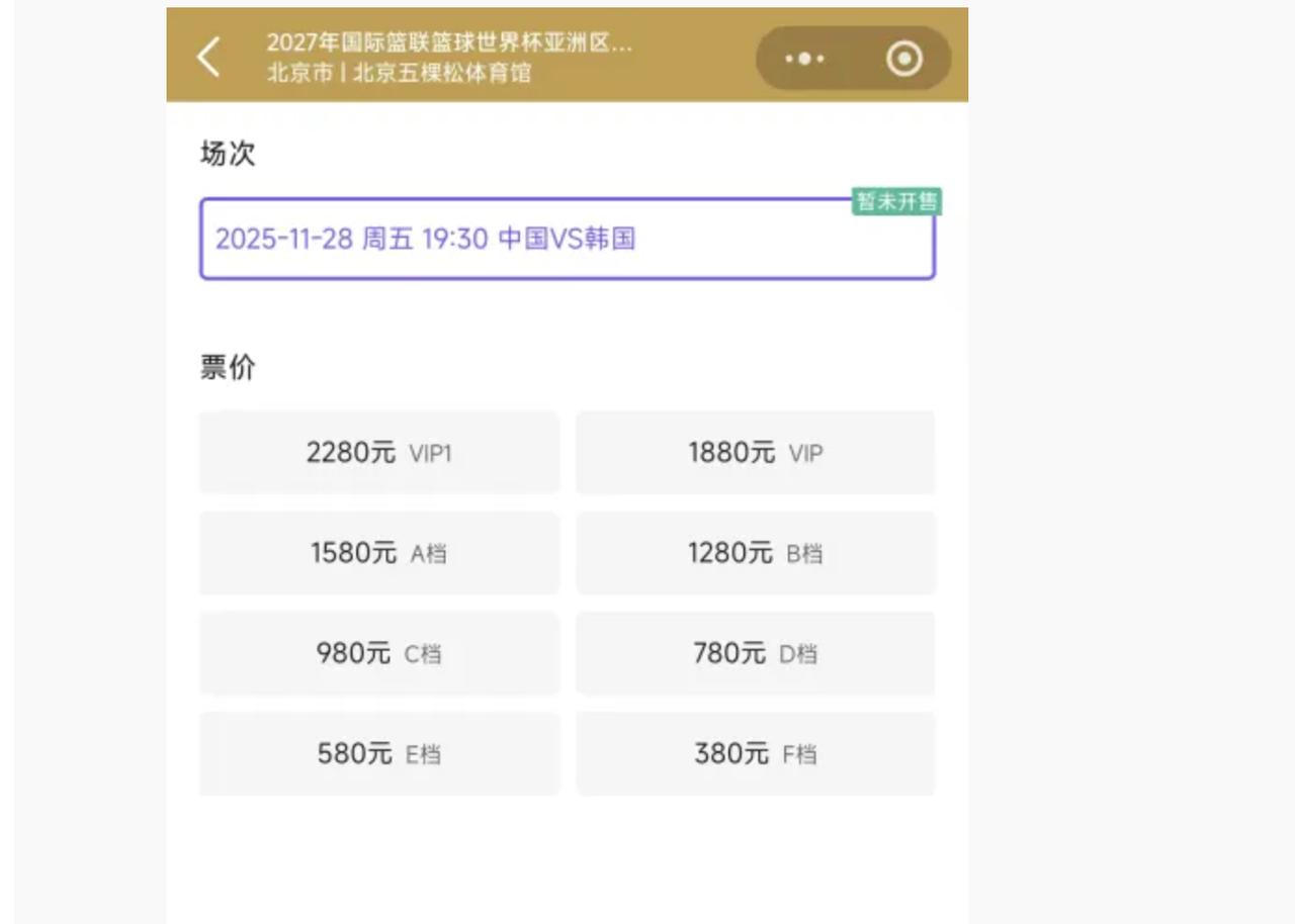中国男篮VS韩国队,票价出炉,一共分为八档,最高档的价格为2280元,最低档价格